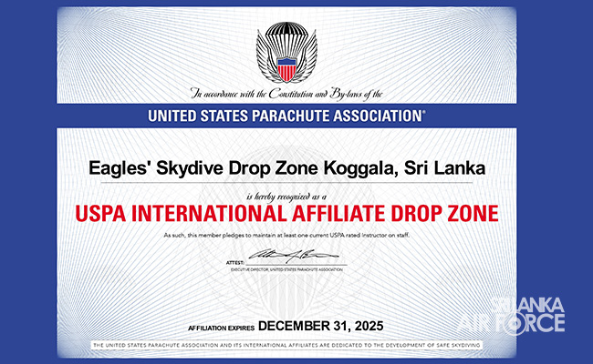 කොග්ගල හි ඊගල්ස් ස්කයිඩයිව් ඩ්රොප් කලාපයට එක්සත් ජනපද පැරෂුට් සංගමයෙන් (USPA) අනුබද්ධිත ඩ්රොප් සෝන් බලපත්රය ලැබේ
