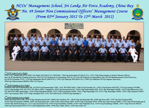 The passing out ceremony of the No. 49th Non Commissioned Officers’ Management Course was held at the Non Commissioned Officers’ Management School auditorium of the Sri Lanka Air Force Academy China Bay on 12th March 2012. Air Vice Marshal KVB Jayampathy, the Director of Logistics of the Sri Lanka Air Force graced the ceremony as the Chief Guest.