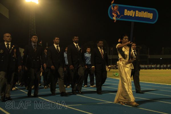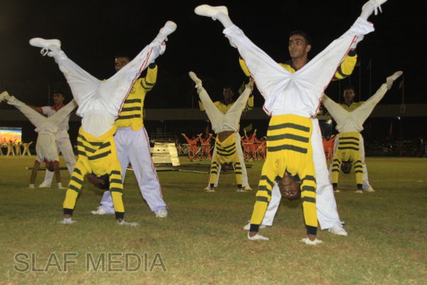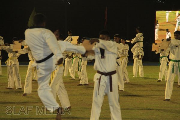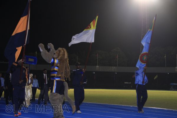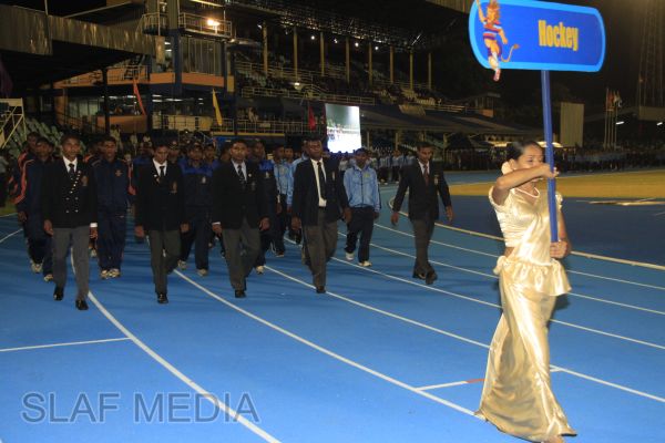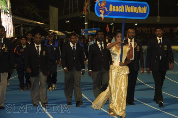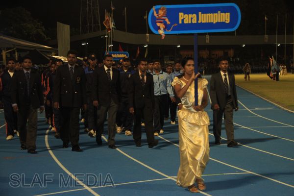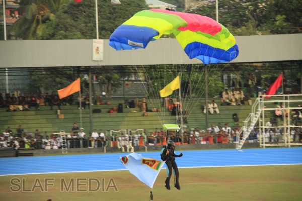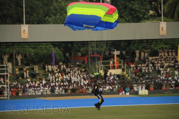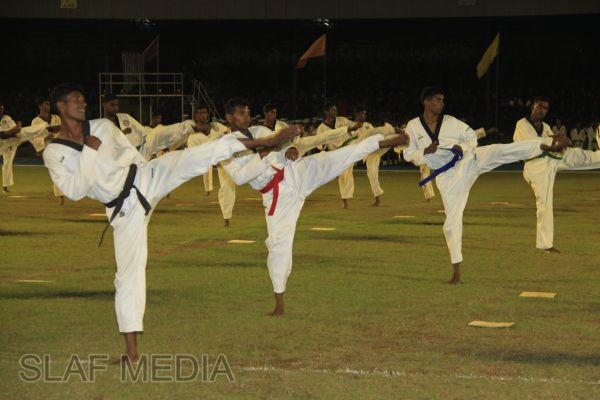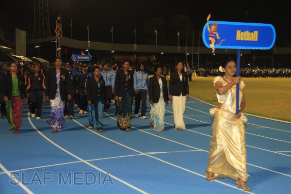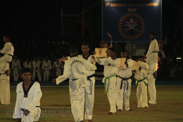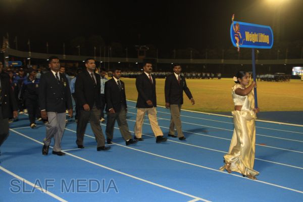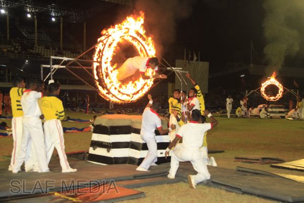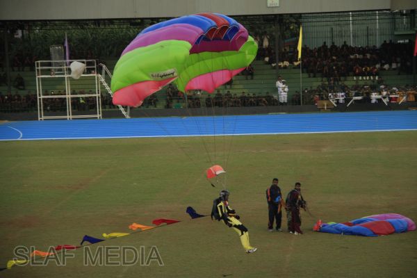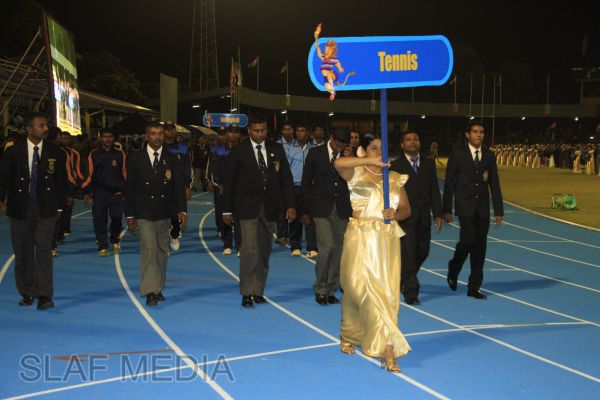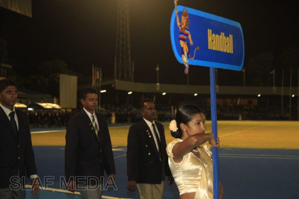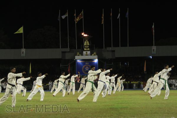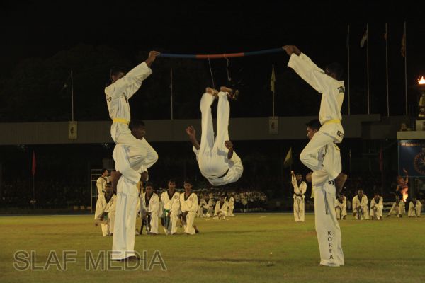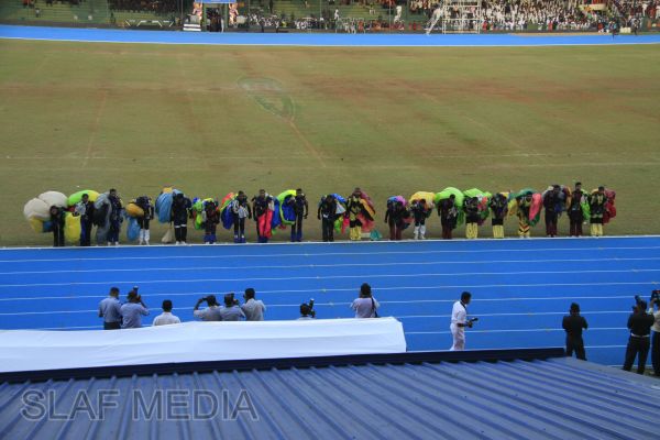 The vibrant event which saw a few of the final athletic events taking place was also the scene of a few colourful displays. A free fall display by paratroopers of the tri-services took place immediately after this which included not only men but two female paratroopers of the Air Force. A 180 strong drum fusion comprising men and women of the tri-services playing Sri Lankan, Indian and African drums followed. After this the spectators were treated to a display of Taekwondo by members of the tri-services which was followed by a massed military band display. The evening's events came to a close with the chief guest Mr Lalith Weeratunga declaring the games closed and the National Anthem being sung.