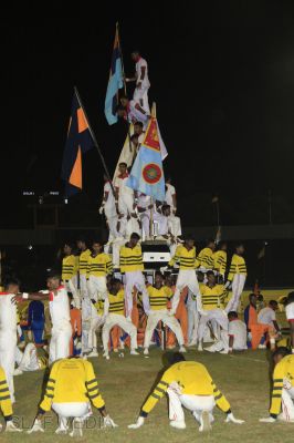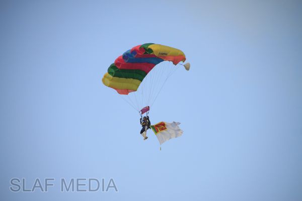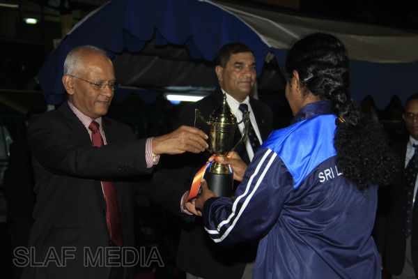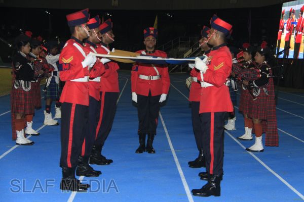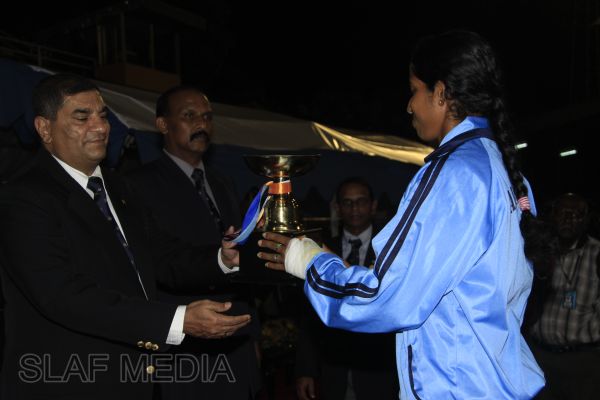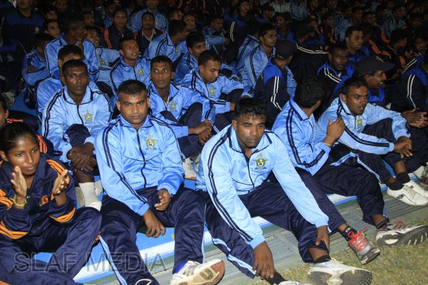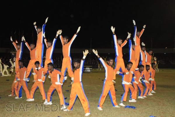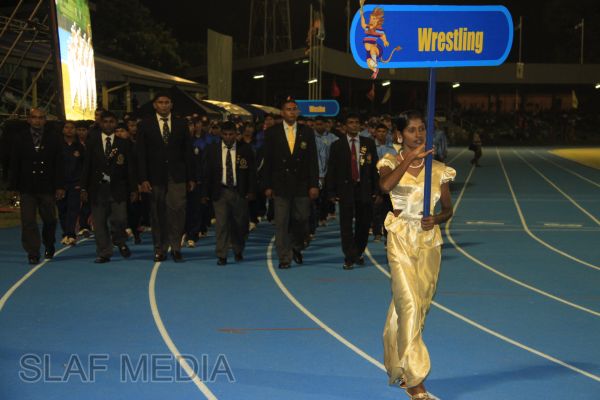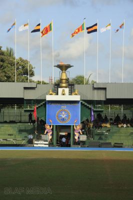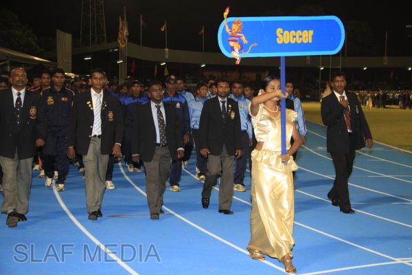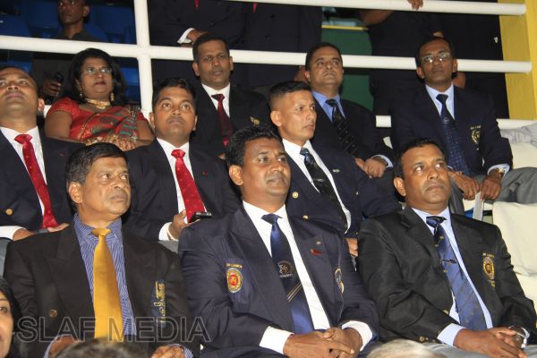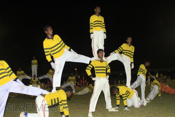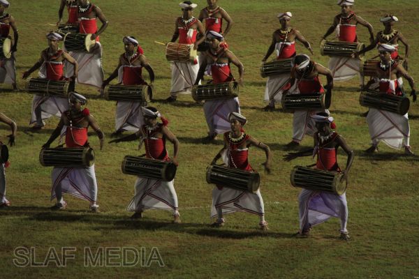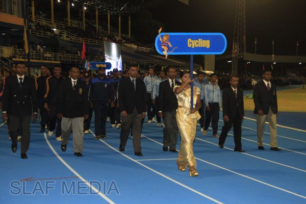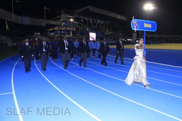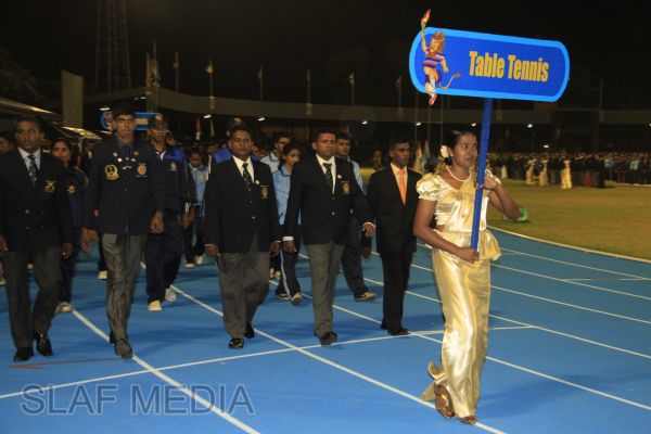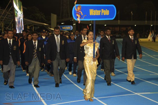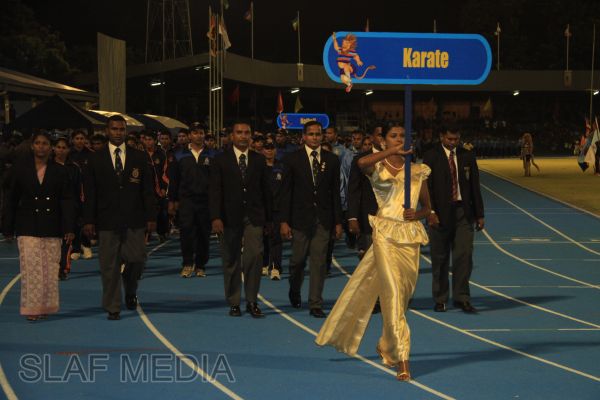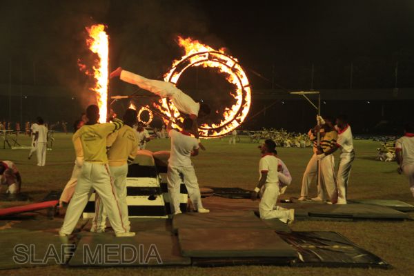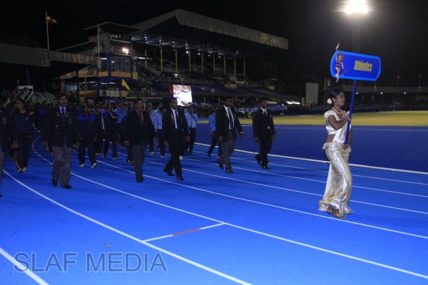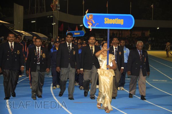 The vibrant event which saw a few of the final athletic events taking place was also the scene of a few colourful displays. A free fall display by paratroopers of the tri-services took place immediately after this which included not only men but two female paratroopers of the Air Force. A 180 strong drum fusion comprising men and women of the tri-services playing Sri Lankan, Indian and African drums followed. After this the spectators were treated to a display of Taekwondo by members of the tri-services which was followed by a massed military band display. The evening's events came to a close with the chief guest Mr Lalith Weeratunga declaring the games closed and the National Anthem being sung.