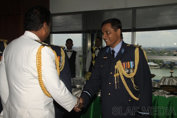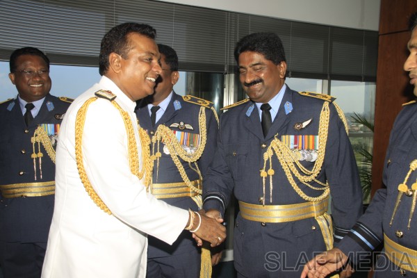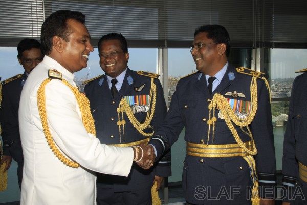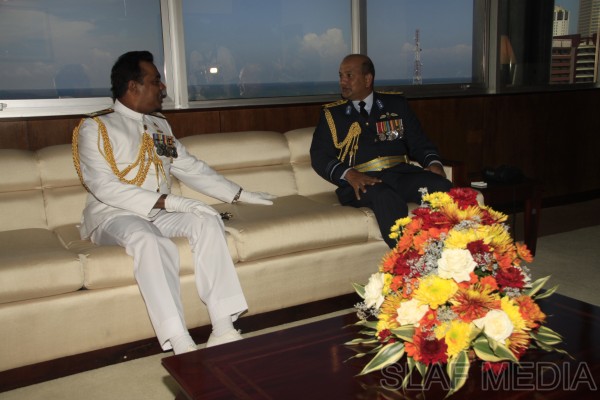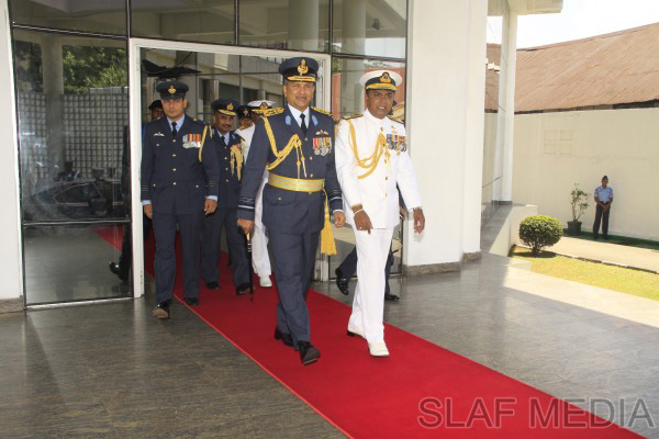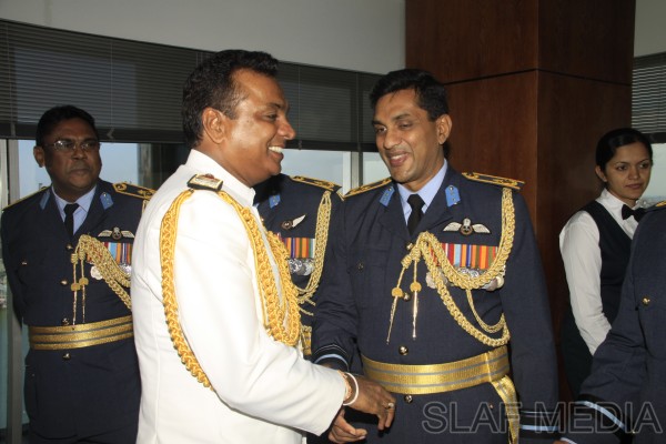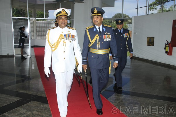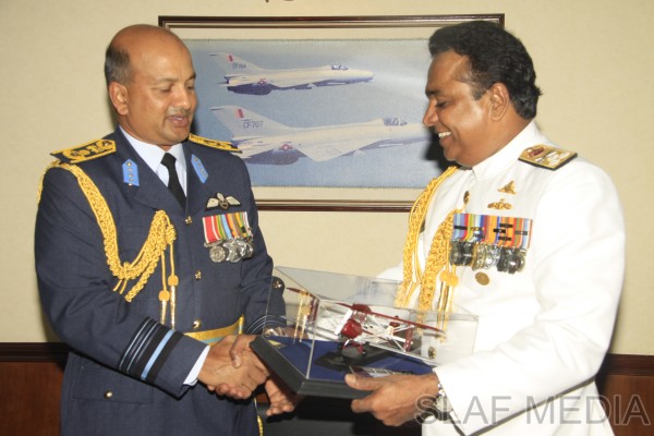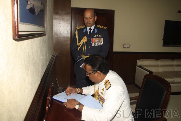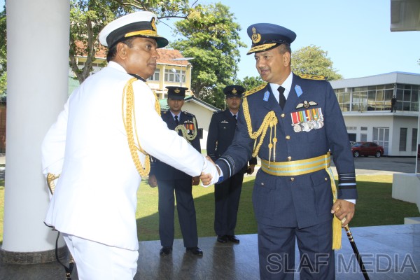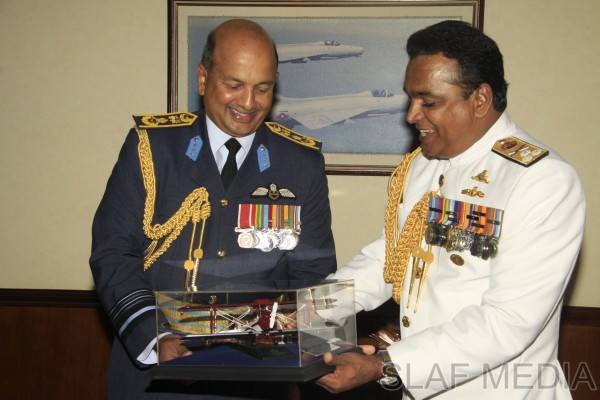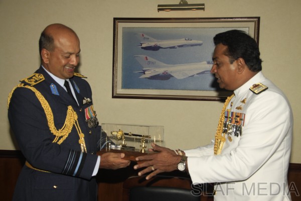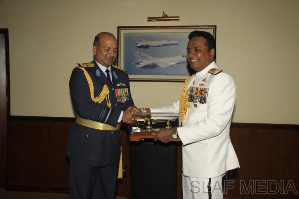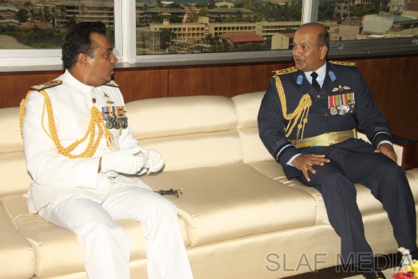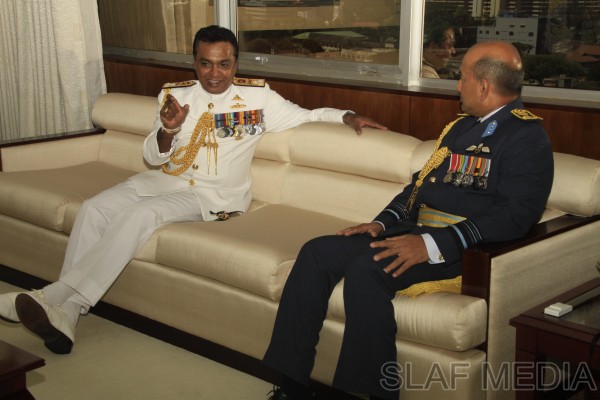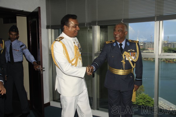 The outgoing Commander of the Sri Lanka Navy, Vice Admiral Somathilake Dissanayake, paid a farewell call on the Commander of the Sri Lanka Air Force, Air Marshal Harsha Abeywickrama, at the Air Force Headquarters, on 21 September 2012.