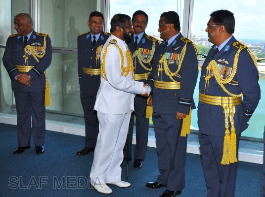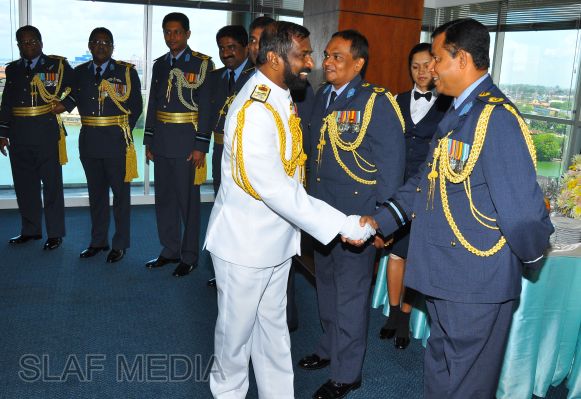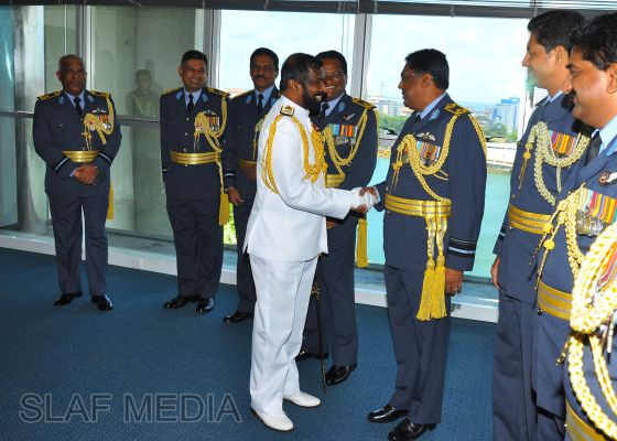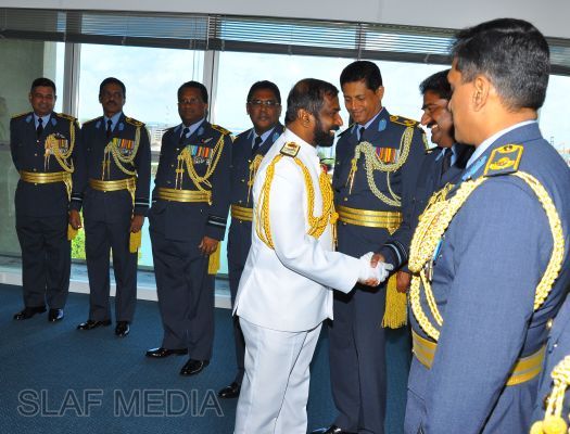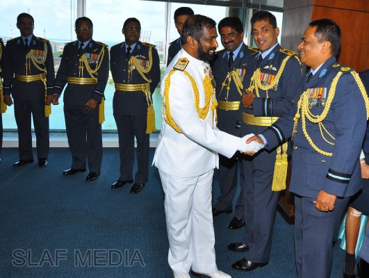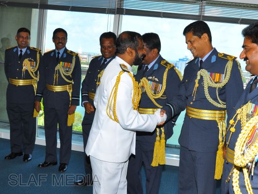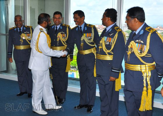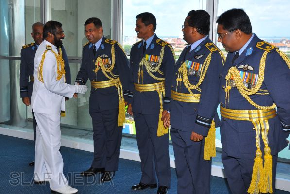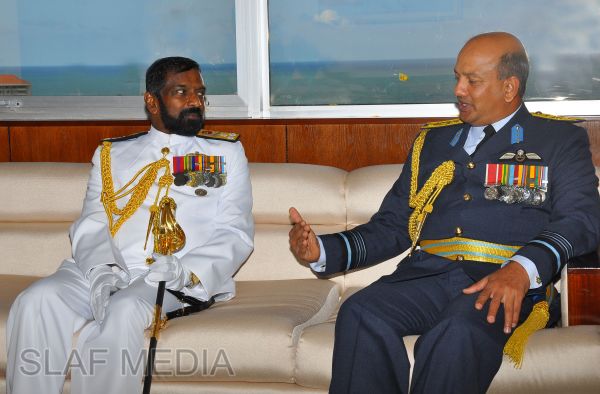 The newly appointed Commander of the Sri Lanka Navy, Vice Admiral Jayanath Colombage, paid a courtesy call on the Commander of the Sri Lanka Air Force, Air Marshal Harsha Abeywickrama, at the Air Force Headquarters this morning (02 October 2012).