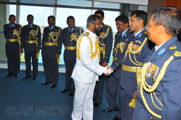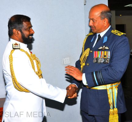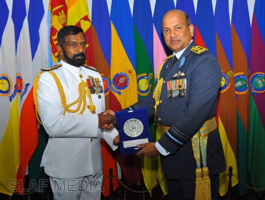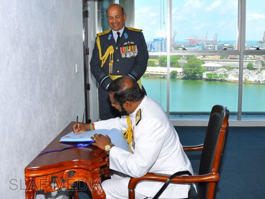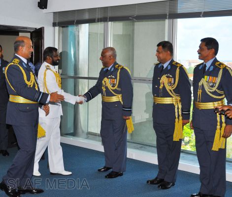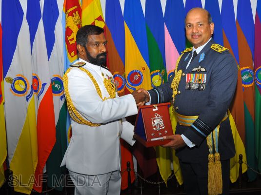 At the end of the visit, the two Commanders exchanged mementoes to mark this special occasion and the Navy Chief entered his thoughts in the Visitors Book on his maiden visit to Air Force Headquarters in the capacity of the Commander of the Sri Lanka Navy.