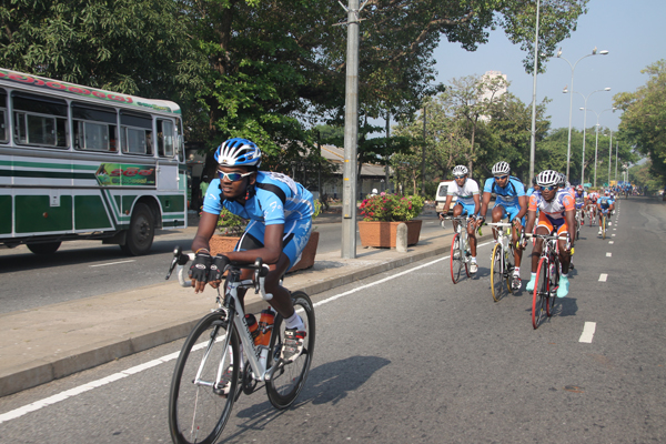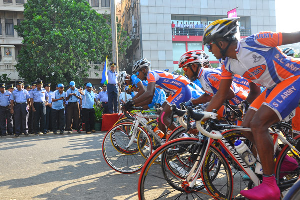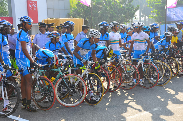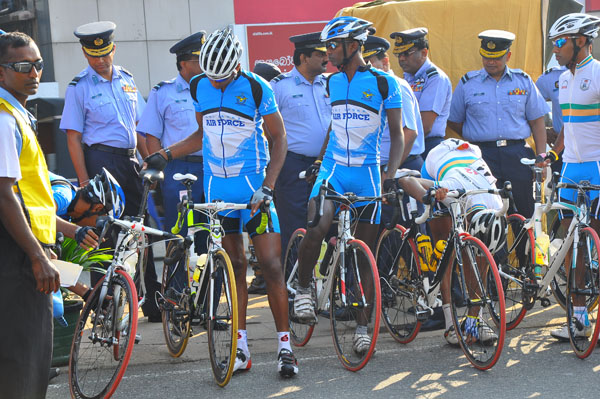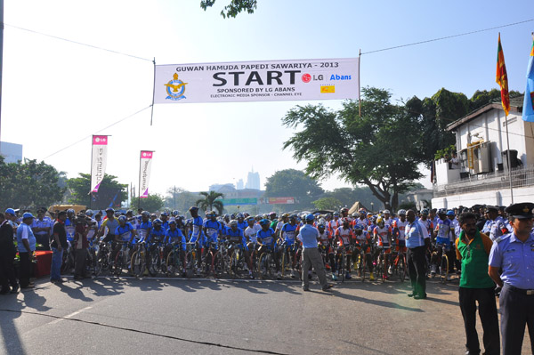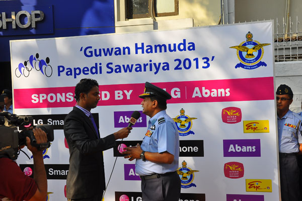 The first leg of the Guwan Hamuda Papedi Sawariya 2013 from AFHQ Colombo to Dambulla organized was flagged off by the Commander of the Air Force Air Marshal HD Abeywickrama this morning. The event is sponsored by LG Abans and the media partner Rupavahini (Channel Eye). The Chief of Staff Air Vice Marshal KA Gunatilleke, the President of the Interim Committee of the Cycling Federation Air Vice Marshal GP Bulathsinghala, the Air Force Board of Management, senior officers, officers, other ranks and many cycling enthusiasts were present at the start of the event. A total of 126 cyclists from 13 clubs were flagged off and cyclists from Jaffna and Trincomalee were also part of the list.