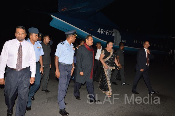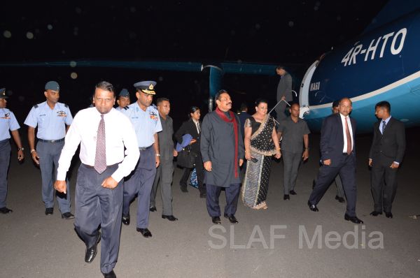 HE the President Mahinda Rajapaksa returns to Colombo after the Ceremonial Opening of MRIA on a SLAF Helitours MA 60 aircraft.