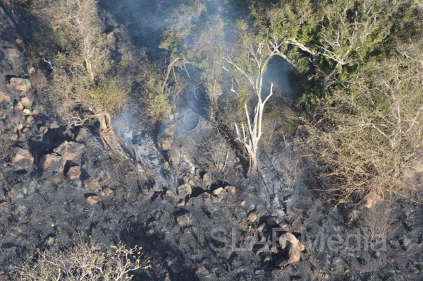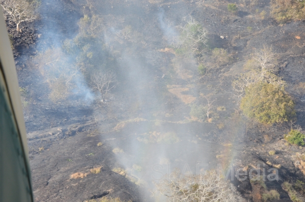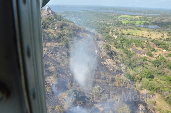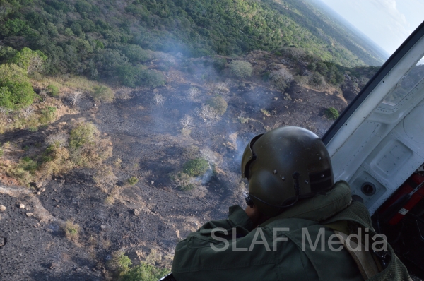 Using water from Mahakanadarawa Tank, the crew of Bell 212 helicopter battled the fire with the aid of its under slung ‘Bambi bucket’ flying 06 consecutive sorties and limited the spread of the raging flames. The SLAF was requested to assist by the Disaster Management Center.