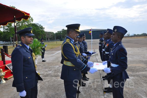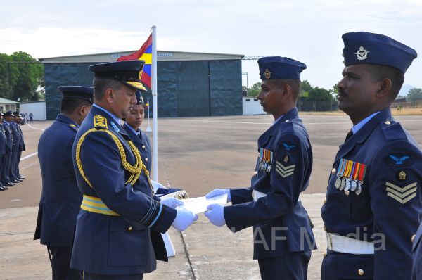Certificates of Commendation were awarded during the parade to 16387 F/Sgt Dulip KMT Air Frame Fitter (Sp), 17412 F/Sgt Bandara HMDI Aero Eng Fitter (Sp), 19191 Sgt Chaminda Kumara WDS Aero Eng (Sp), 27149 Cpl Weerasooriya WMCSB MT Fitter (I) and 022786 LAC Munasinghe MMAB Sheet Metal Worker for the valuable service they rendered to the development of the Base.