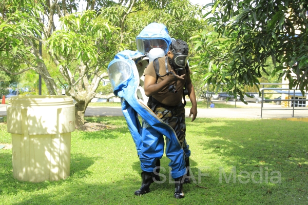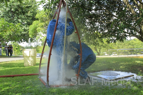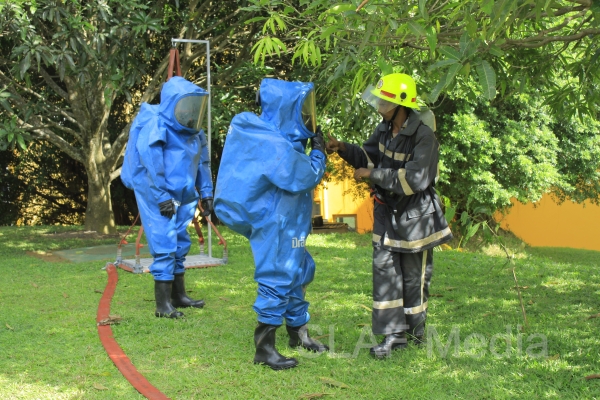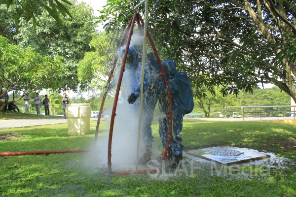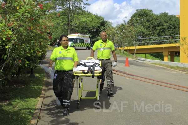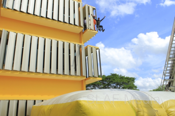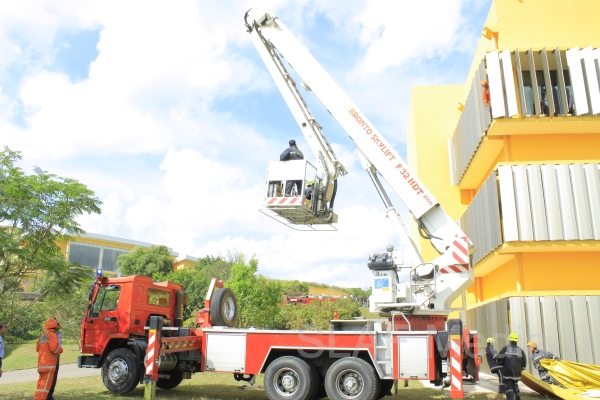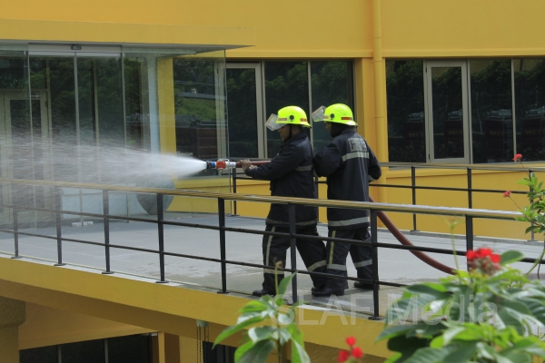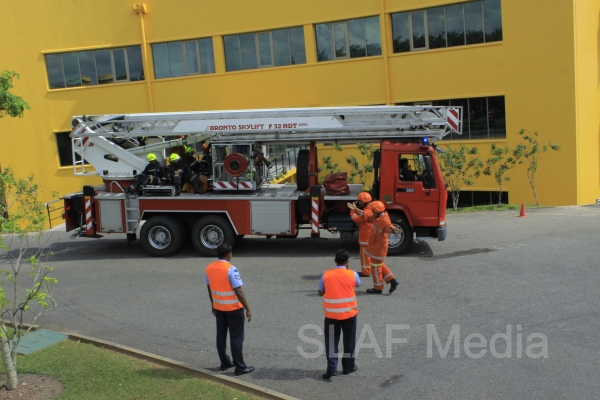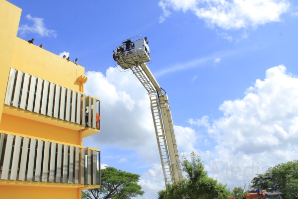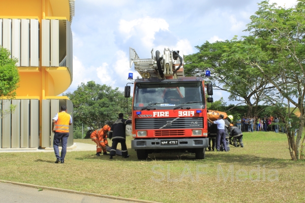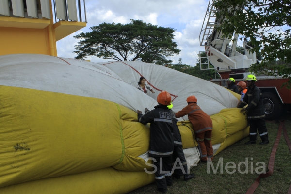 The personnel in the lower floors were afforded a smooth landing by use of the ‘jumping sheet’ (an inflated landing pad) which was placed on the ground. There were also live demonstrations on the use of high-pressure fire hoses to put out fires, initial reactions for chemical fire with breathing apparatus and providing first aid to victims of the fire.