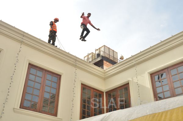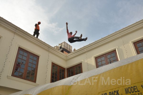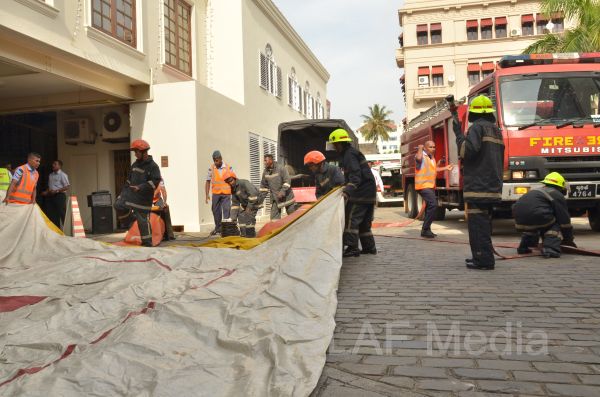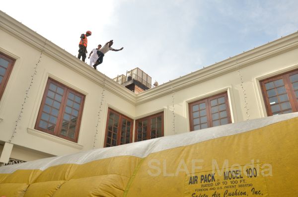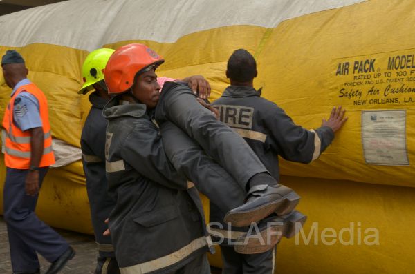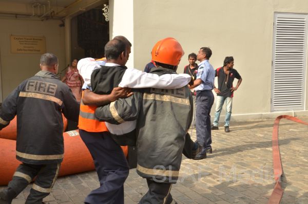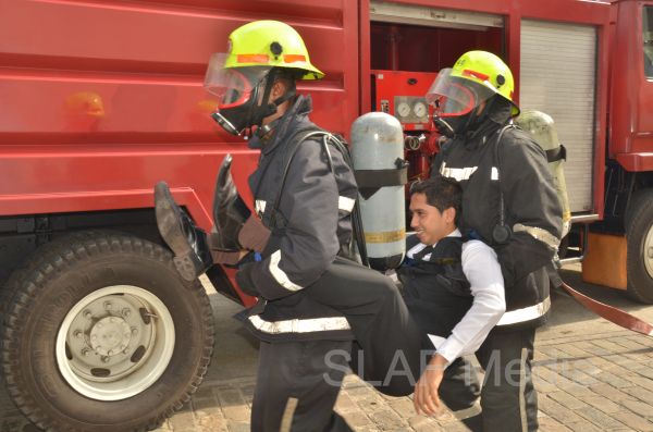 The personnel in the lower floors were afforded a smooth landing by use of the ‘jumping sheet’ (an inflated landing pad) which was placed on the ground. There were also live demonstrations on the use of high-pressure fire hoses to put out fires, initial reactions for chemical fire with breathing apparatus and providing first aid to victims of the fire.