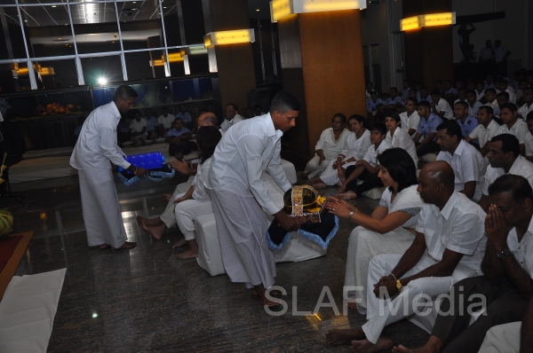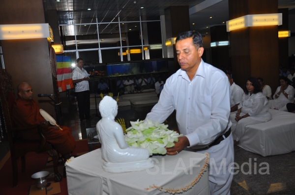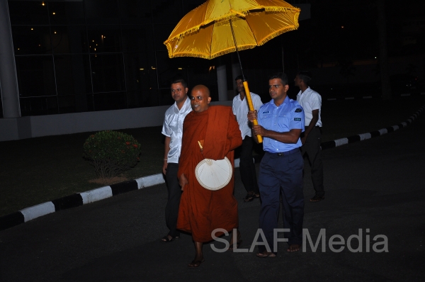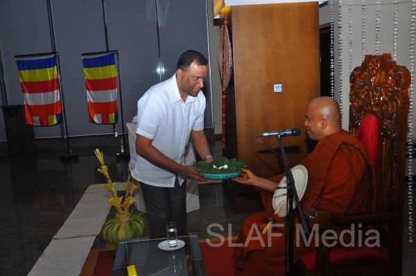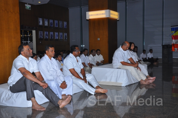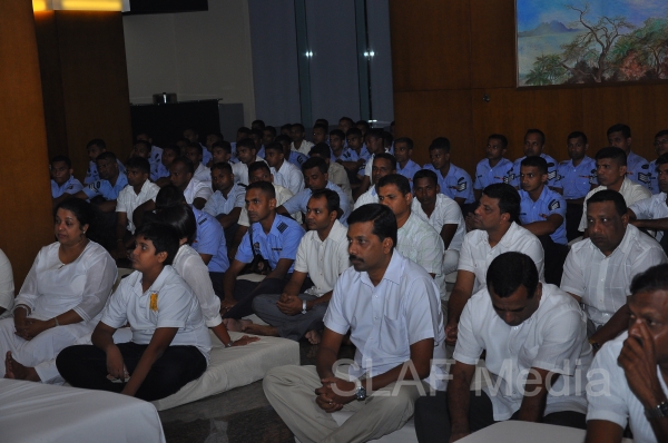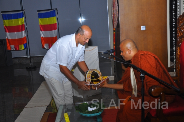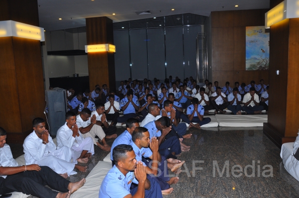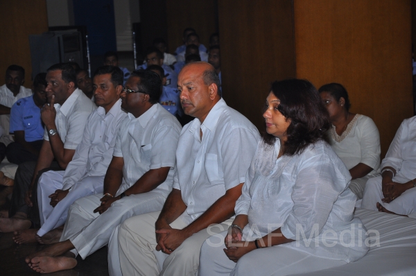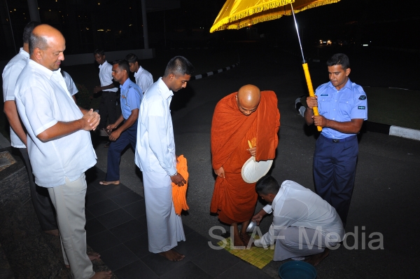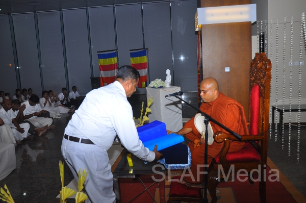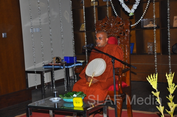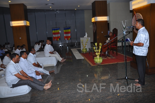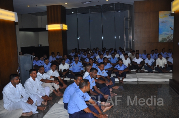 A Dharma Deshana programme presided by Venerable Walasmulle Gunarathana thera, the Chief Incumbent of Thanamalwila Kithulkote Rathana Sadaham Meditation Centre, was held at SLAF Headquarters this evening (28th November 2013). The Commander of the Air Force Air Marshal Harsha Abeywickrama, Chairperson of the Sri Lanka Air Force Seva Vanitha Unit Mrs. Neelika Abeywickrema, members from the Air Force Board of Management, senior officers, other ranks and civilians participated in the programme.