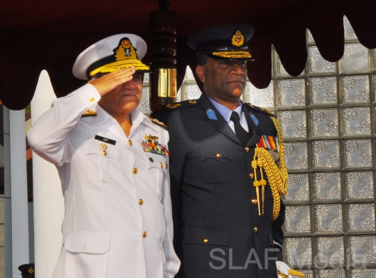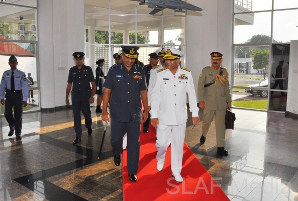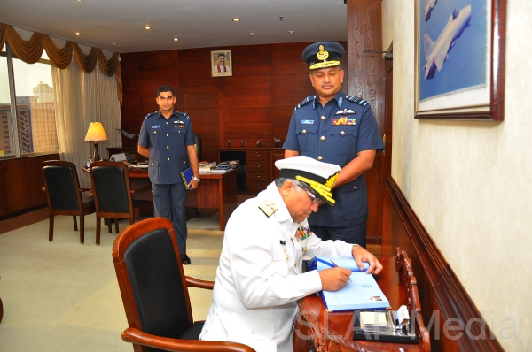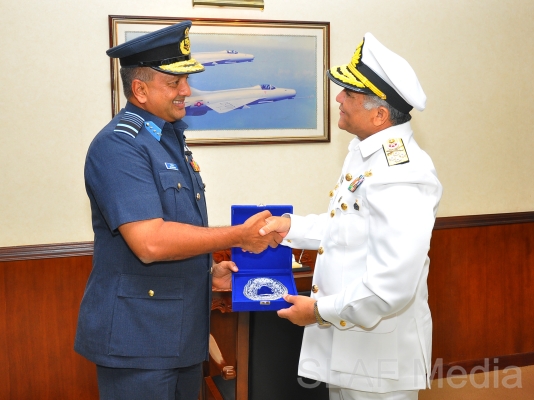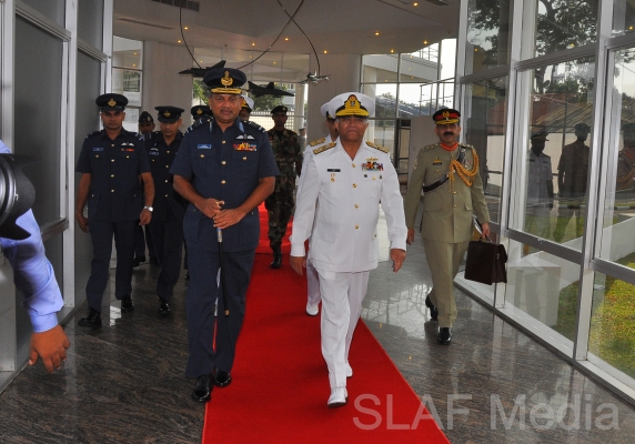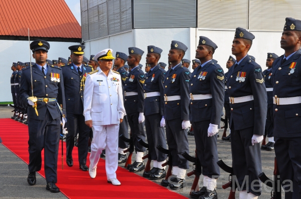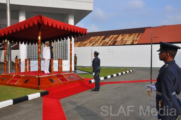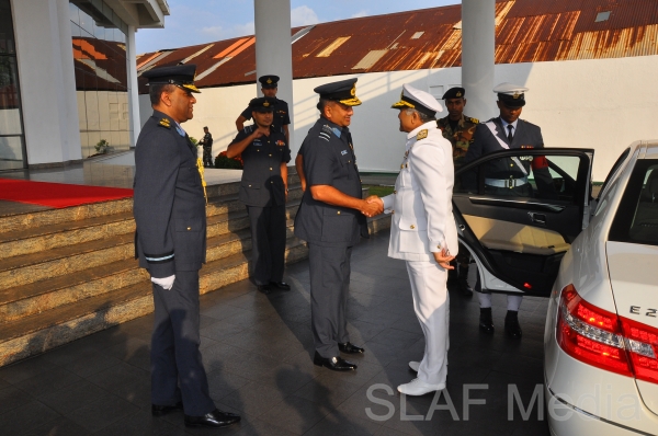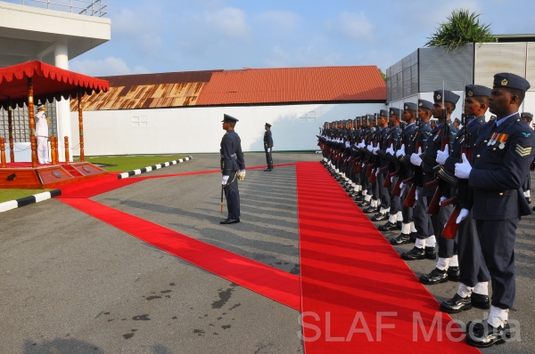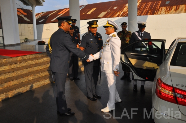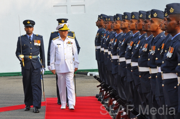 The Chief of the Naval Staff was received upon arrival, by the Commander of the Sri Lanka Air Force Air Marshal Harsha Abeywickrama and was afforded a Guard of Honour which was conferred by the Colour Squadron of the SLAF. The Guard of Honour was commanded by Flight Lieutenant OWKP Owitipana.