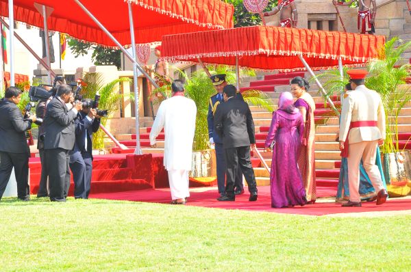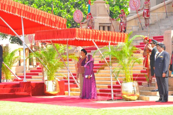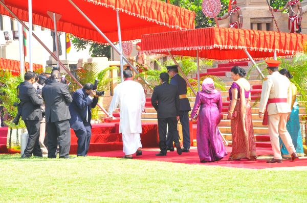 On arrival, at the Presidential Secretariate, the President of Maldives and the First Lady Madam Fathimath Ibrahim were received by HE the President Mahinda Rajapaksha and the First Lady Madam Shiranthi Rajapaksa. The Commander of the Sri Lanka Air Force Air Marshal Harsha Abeywickrama was also present on the occasion.