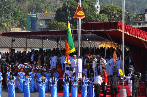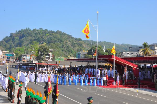The celebrations commenced with the hoisting of the National Flag by His Excellency the President amidst the beating of “magul bera” and blowing of conch shells. Later, three service Commanders and the Inspector General of the Police conducted the President to the special dais, opposite which twenty-five school girls recited Jayamangala Gatha to invoke blessings of the noble Triple Gem on the Nation and also the “Devo Vassatu Kalena” stanza to bless the Nation.