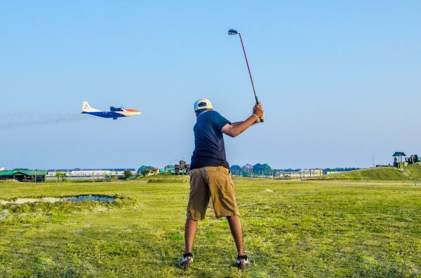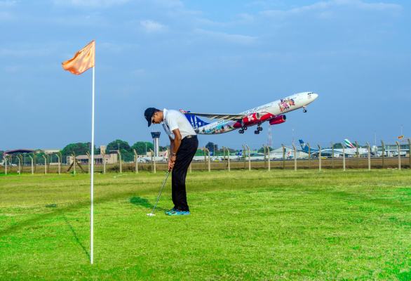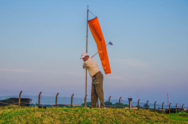 The challenges of the course include water hazards, sand bunkers and mounds, roughs and doglegs. Also, wake turbulences and wingtip vortices of wide-bodied international passenger aircraft as well as roaring fighter jets taking-off and landing add to the challenge. To enhance the excitement of the golfer, the second teeing ground is placed at the bund of a 95 yard water hazard of the second fairway, while the fourth teeing ground is placed just underneath the windsock where a golfer can get the idea of wind direction and strength. The view of the sunrise through the greenish peaks and the red western skies at sunset add to the wonder of the course.