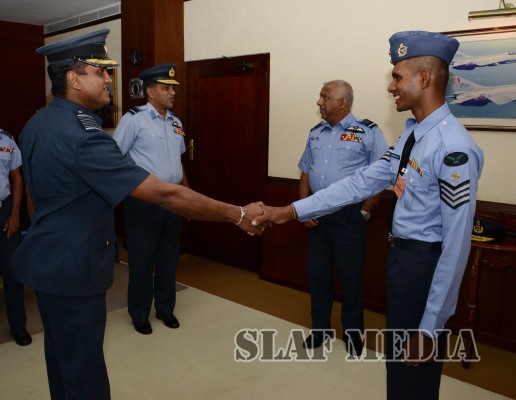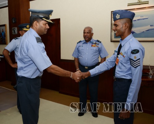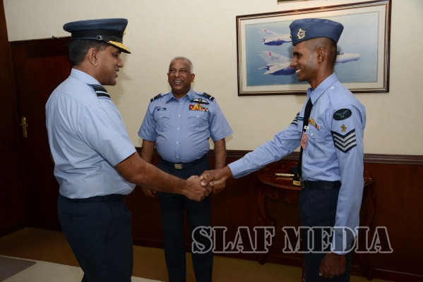 F/Sgt Jayathilake NR, who became the best airman of year 2014, was promoted to the Rank of Warrant Officer by the Commander of the Air Force, Air Marshal Kolitha Gunatilleke this morning (10 March 2015).