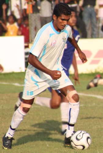 Leading Aircraftsmen Raheem, right half, Lankeshwara Bandara, centre defence, and Shanmugarajah Sanjeewa, centre forward are an integral part of the Sri Lanka Soccer team that is playing in the "AFC Challenge Cup" from 14th to 27th at the Sugathadasa Stadium and the CR&FC Grounds.
