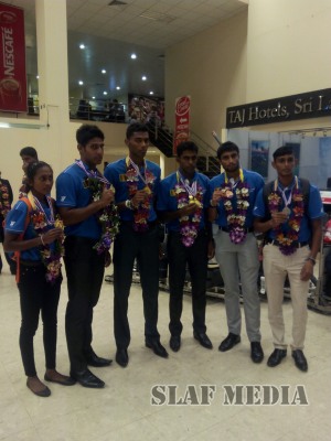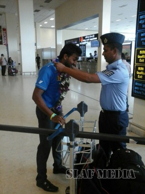 The two athletes were welcomed by Air Force officials at the Bandaranaike International Airport.
