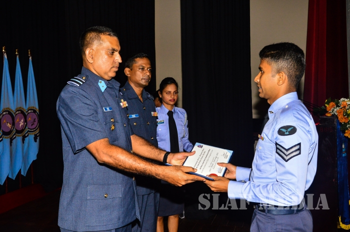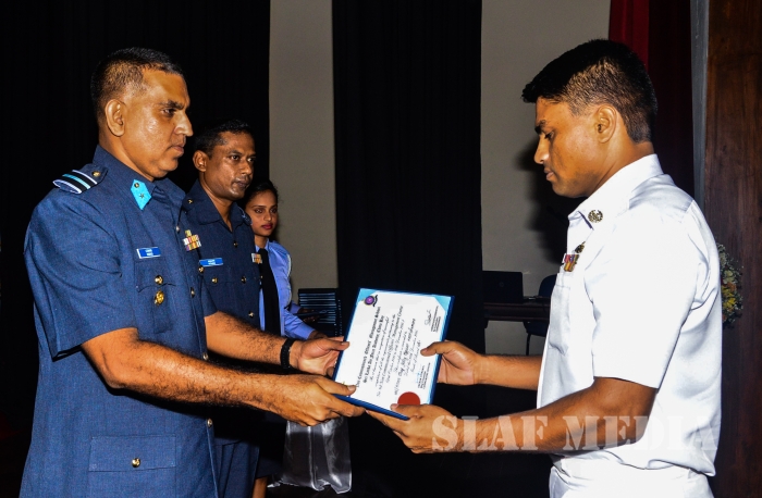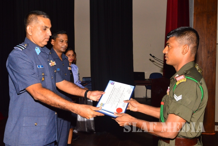 The primary objective of conducting this course is to impart a sound academic and managerial knowledge base while sharpening leadership qualities within Non Commissioned Officers of the SLAF. The course runs through a well-formed Syllabus over a scheduled period of 10 weeks. The comprehensive course is affiliated to the University of Rajarata and all Non Commissioned Officers who fulfil the required criteria will be awarded with a certificate in management. The No. 64 batch comprising of 40 Senior Non Commissioned Officers of SLAF, 43 Junior Non Commissioned Officers of SLAF, 01 Senior Non Commissioned Officer of SL Army, 01 Chief Petty Officer and 01Petty Officer of SL Navy. Certificates were awarded to above declared course for 86 Non Commissioned Officers to acknowledge the successful completion of the course.