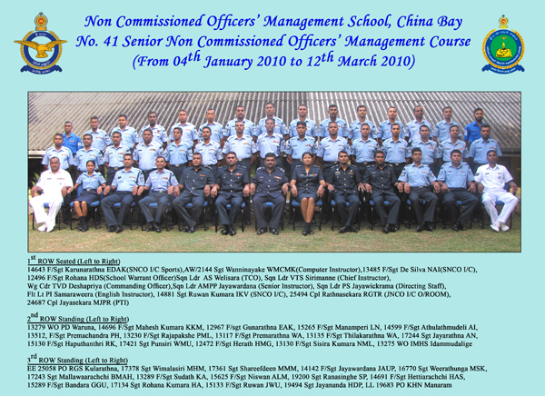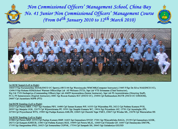 the SLAF, held its graduation ceremony for the 41st Batch of NCO's to complete the course recently (12th march 2010). The course which has a duration of approximately 3 months mainly focuses on sharpening the leadership and management skills of its trainees.
