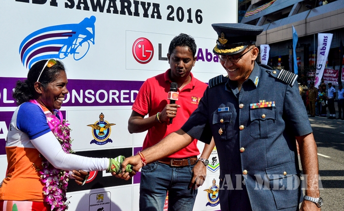 In the women’s race held on 27th February 2016 from SLAF TTS Ekala to Colombo, UD Sriyalatha came in 1st and AF cyclists Sudarika Priyadarshani & Dinusha Dilrukshi finished 2nd & 3rd respectively. The team event was won by the Sri Lanka Air Force team.