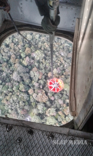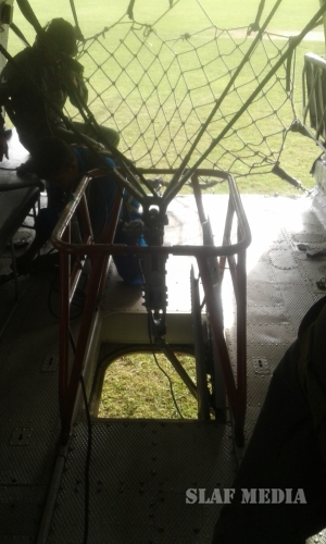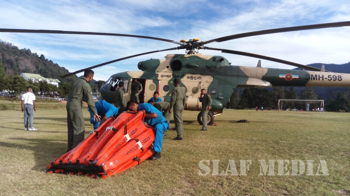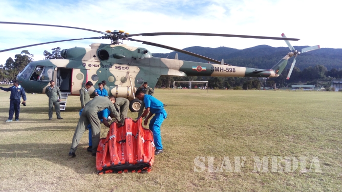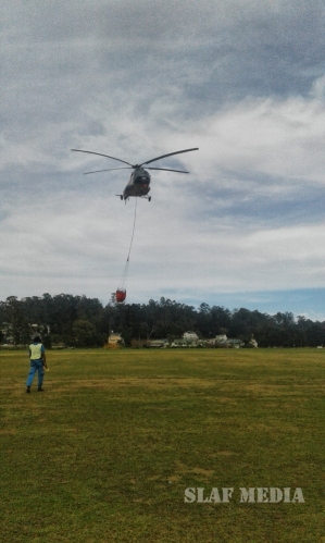 Hence, Mi 17 Helicopter Captained by the Commanding Officer of No 6 Squadron Gp Capt SDGM Silva, Co-Pilot Sqn Ldr NDID Jayasekara, Flight Engineer Sqn Ldr HB Fernando and a Load master, an Air gunner and 03 x technicians were airborne from SLAF Base Anuradhapura at 0610 hrs. They positioned the helicopter at Nuwaraeliya Race course to fix Fire Fighting apparatus to carry water from Kande Ela Reservoir and doused the fire in general area of Sandirigama watta, Dayagama.