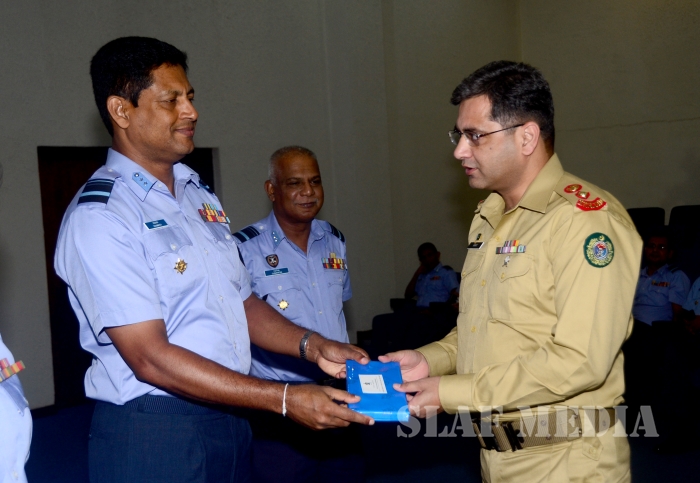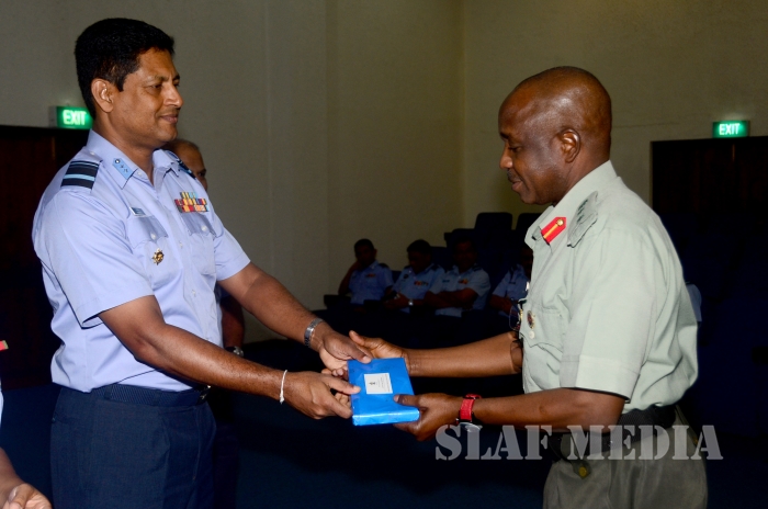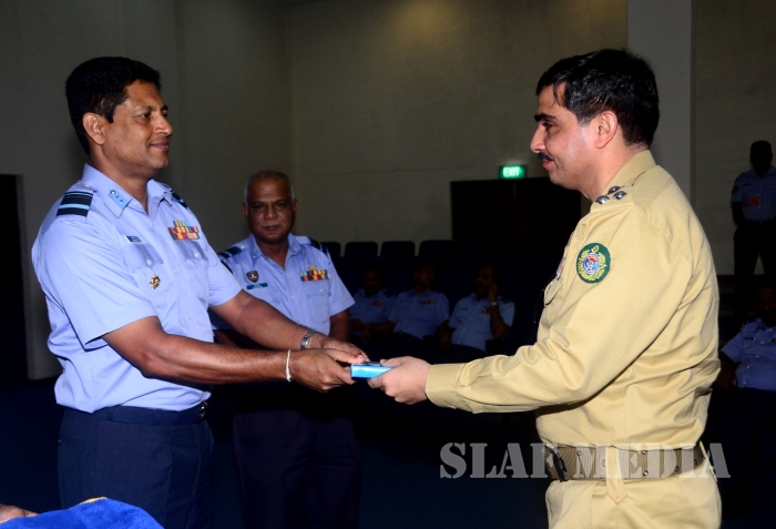 Subsequently, a presentation was conducted by Group Captain Lasitha Sumanaweera, the Senior Staff Officer Air Operations on ‘Post Conflict Role and Challenges’ of the Sri Lanka Air Force and interactive Q & A session was held with the participation of Air Force Board of Management. The Director Ground Operations Air Vice Marshal Krishan Yahampath and the Director Training Air Vice Marshal Vijitha Gunarathne joined to bestow mementos to the NDC delegation to mark this visit.