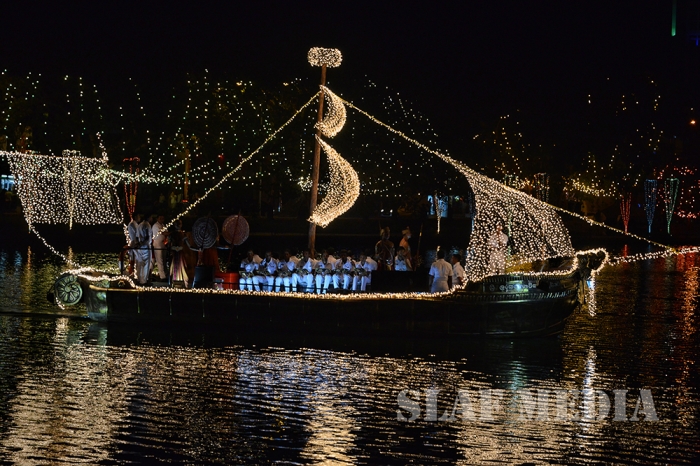 On the invitation of the chief priest of the Gangarama temple the most venerable Galaboda Gnanissara Thero, the Commader of the Air Force, Air Marshal Gagan Bulathsinghala switched on the lights to illuminate the Gangarama Vesak Kalapaya on the 23 May 2016, the day allocated for the Air Force.