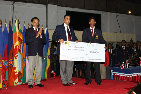 Cpl Suresh Pattiarachchi , who won bronze medal in the 5th Commonwealth games was presented Rs 75,000/= by Commander of the Air Force Air Chief Marshall Roshan Goonetileke.