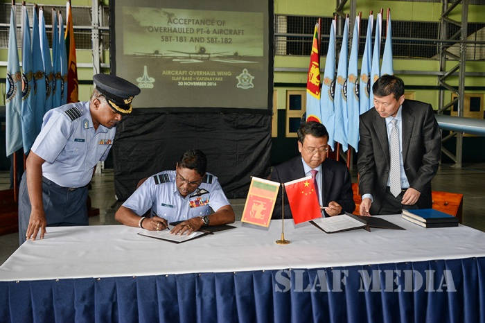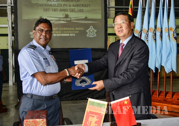 The first two PT-6 Aircraft to be overhauled at the Aircraft Overhaul Wing at Sri Lanka Air Force Base, Katunayake, were accepted by the Commander of the Sri Lanka Air Force, Air Marshal Kapila Jayampathy this morning at a simple ceremony at Katunayake. The event was attended also by the Chief of Staff of the Air Force, Air Vice Marshal Sumangala Dias, members of the Air Force Board of Management and other officers as well as representatives of the Aviation Engineering Division of the M/S CATIC of China, who are partnering the SLAF in this technology transfer project.