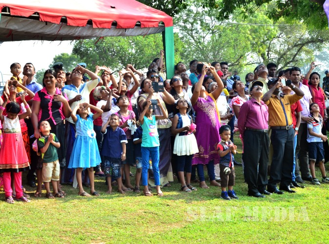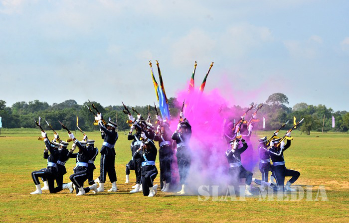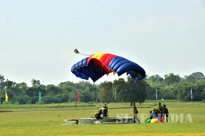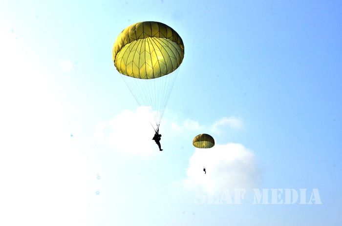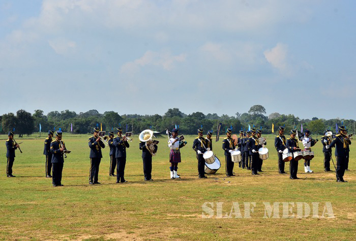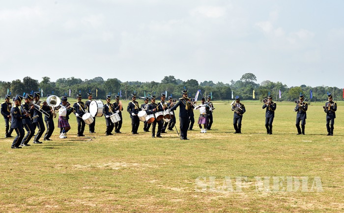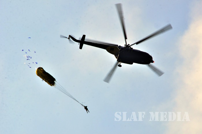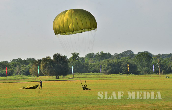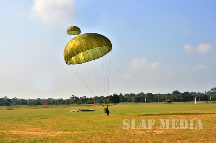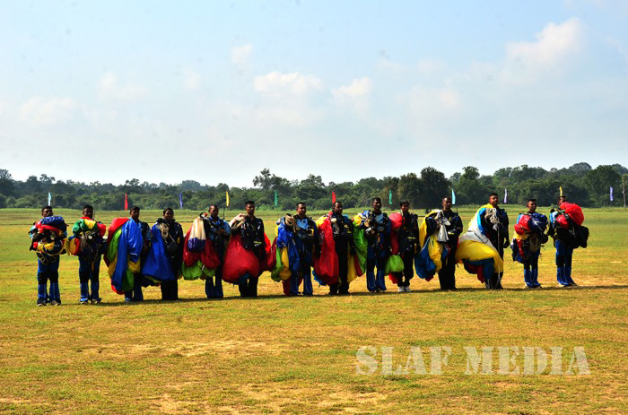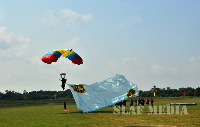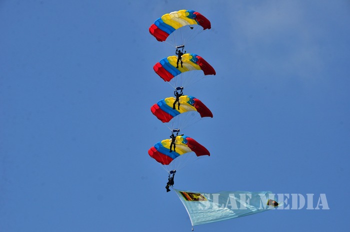 The parade commenced with static line jumps of the trainees from an MI 17 Helicopter at 3500 feet. After that, the Sky divers of the SLAF performed a magnificent show, exiting at 10000 feet from the same Helicopter. Squadron Leader MAV Gomes landed with the Air Force Flag. Sky Divers Canopy Relative Work (CRW) added more colour to the ceremony.