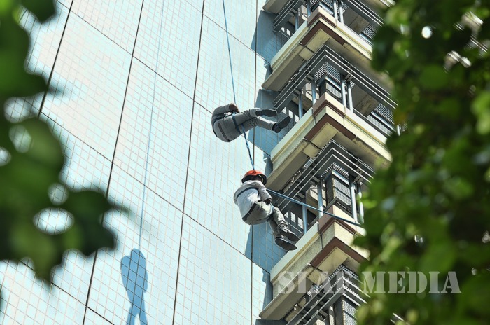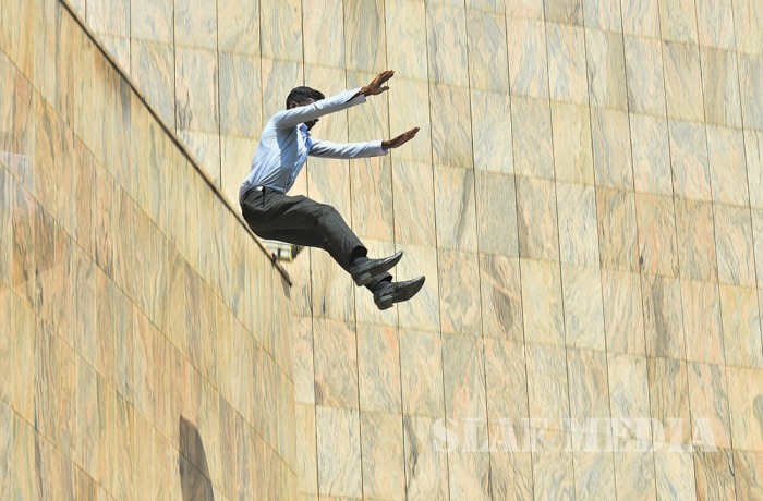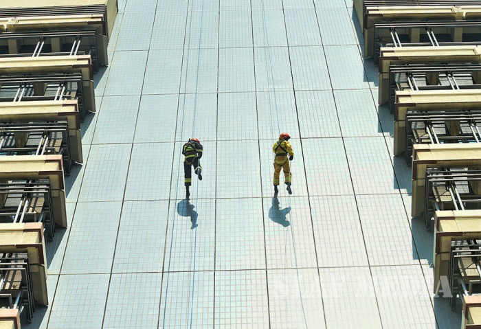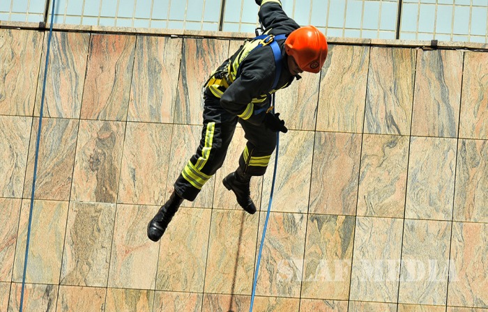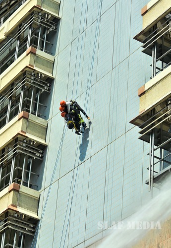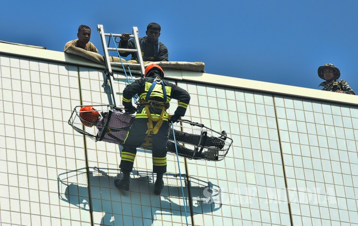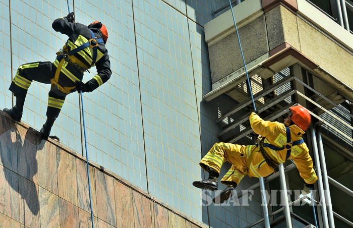 The SLAF fire fighters demonstrated several rescue tactics such as aerial rope rescue and high angle rescue using the Bronto sky-lifter.