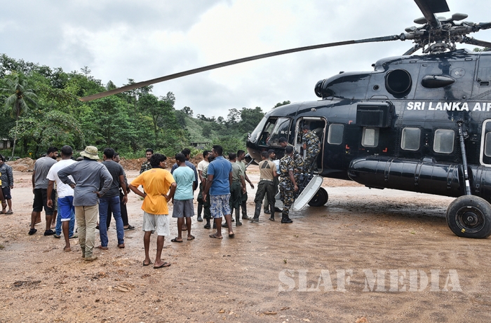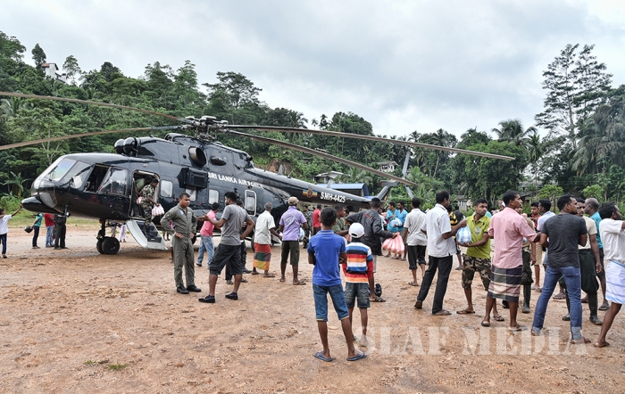 Today, the Bell 212, Bell 412 and MI 17 helicopters continued their operations and transported more than 39266 cooked meals, 5206 kgs of dry rations, 4037 Ltr of water bottles and copious amounts of medical items and other supplies to the relief centres inBulathsinhala, Bellana, Baddegama and Rathnapura areas. This accounted for a total number of 52 flying sorties with more than 24 hours 15 minutes of flight time on multiple platforms. In addition, the Air Force was able to successfully accomplish the arduous task of delivering relief items to isolated groups, who are unable to again access to the disaster relief camps, in the flood stricken areas.
