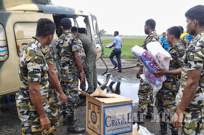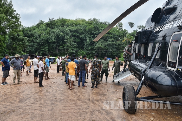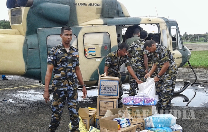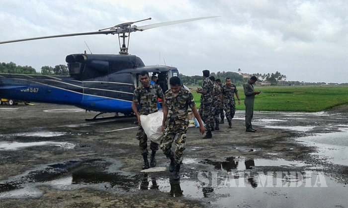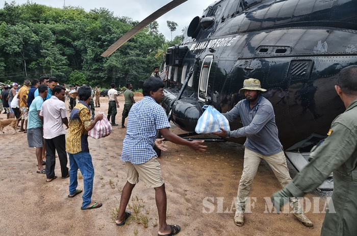 Sri Lanka Air Force dispatched its helicopters throughout the day to airlift relief aid as a part of its holistic Humanitarian Assistance and Disaster Relief (HADR) operations to assist the national emergency response to the flood affected areas of the country. The Air Force disaster relief and management mechanism, which was initiated on 26th May 2017 under the personal direction of the Commander of the Air Force, Air Marshal KVB Jayampathy, has been conducting airlift, rescue and evacuation missions successfully with continuous situation monitoring and efficient management of air assets.