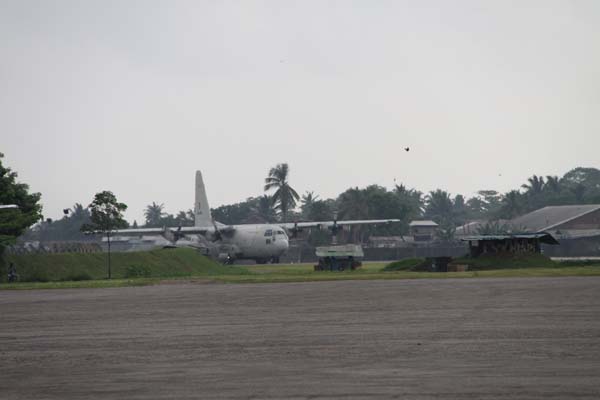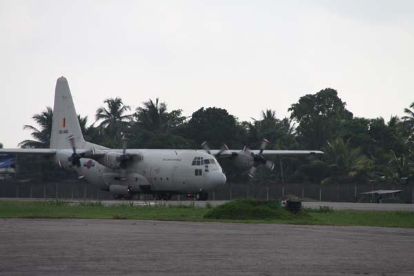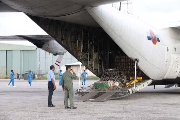 The first C-130 aircraft carrying urgently needed saline