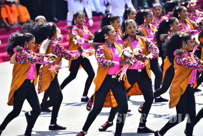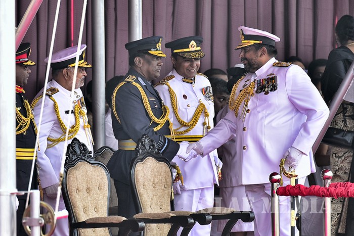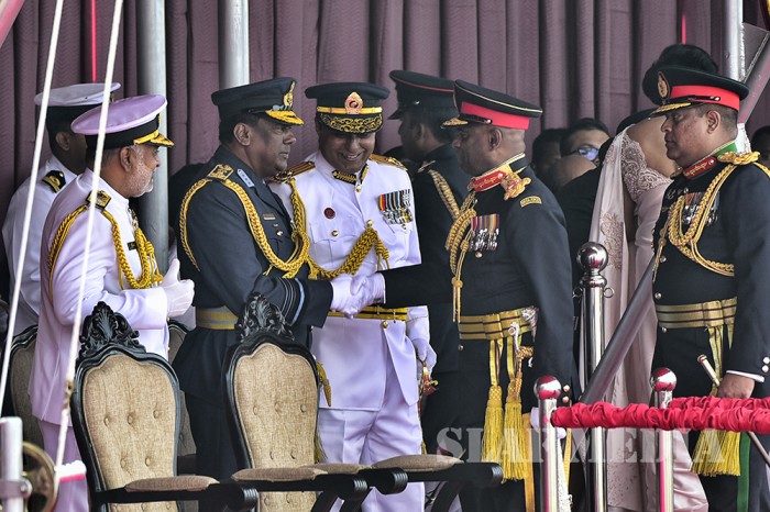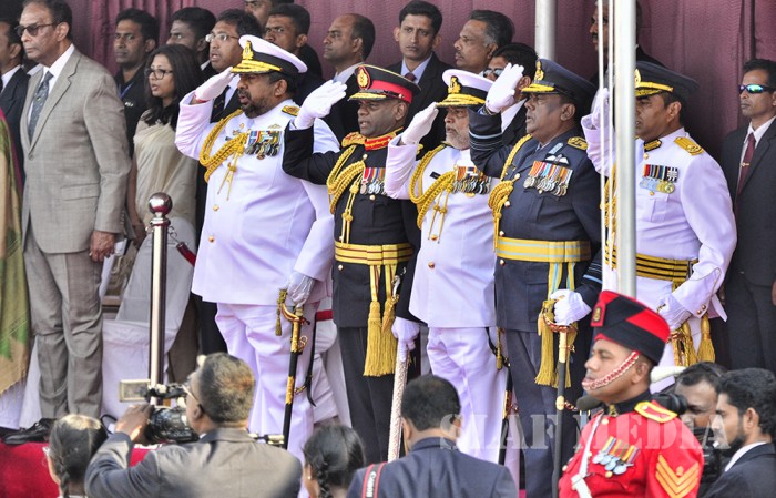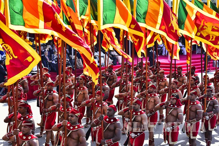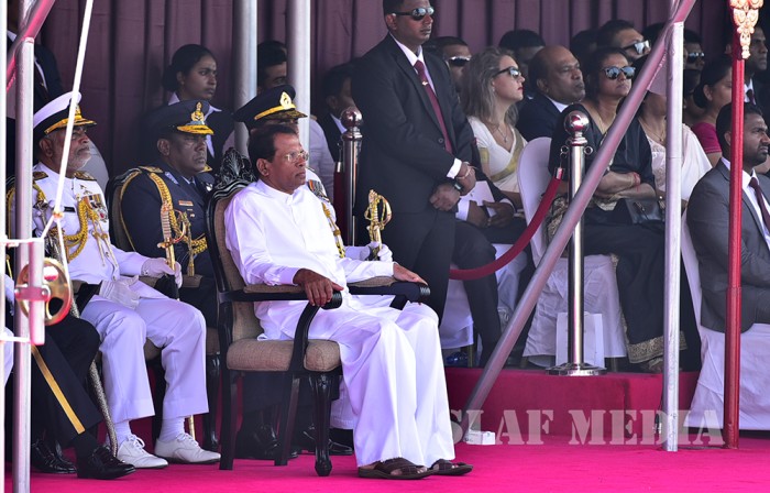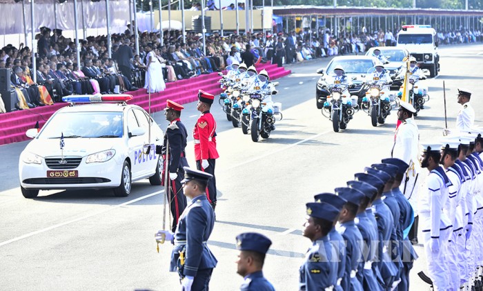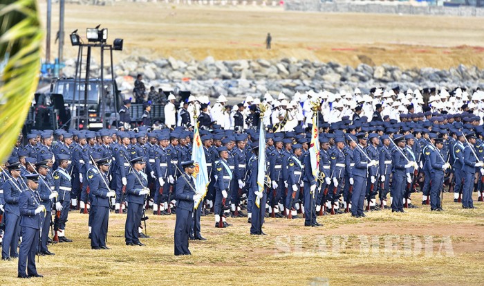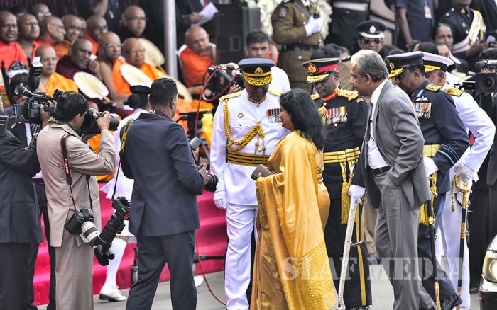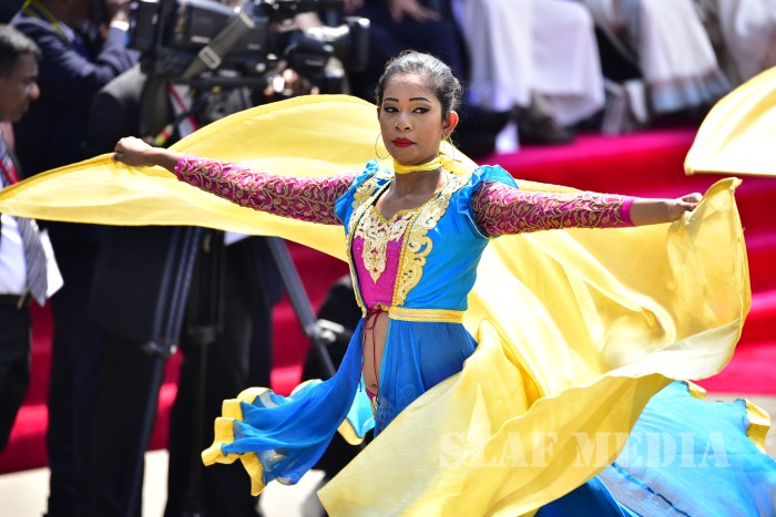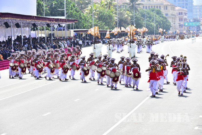 The celebrations commenced with the hoisting of the National Flag by His Excellency the President amidst the beating of “magul bera” and blowing of conch shells. Later, three service Commanders and the Inspector General of the Police conducted the President to the special dais, opposite which twenty-five school girls recited Jayamangala Gatha to invoke blessings of the noble Triple Gem on the Nation and also the “Devo Vassatu Kalena” to bless the Nation.