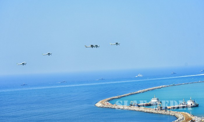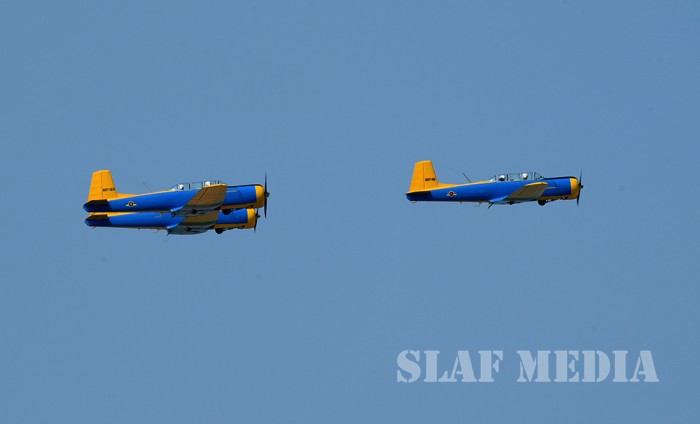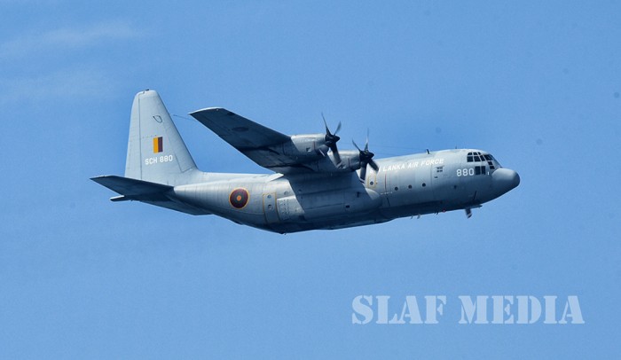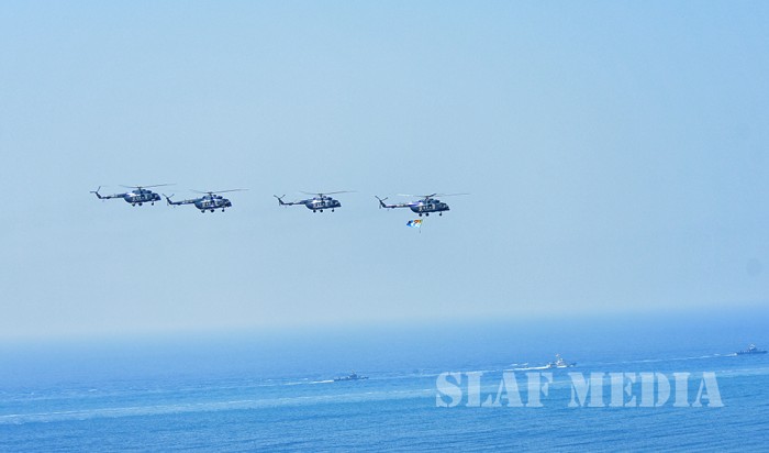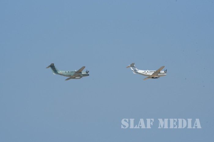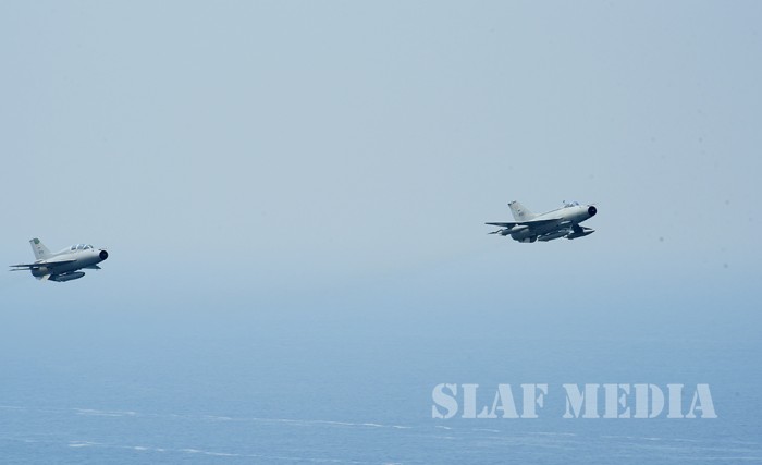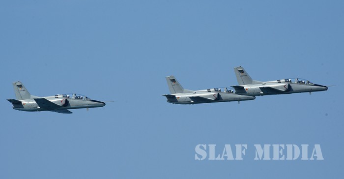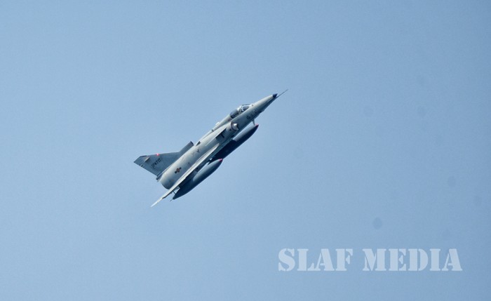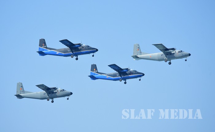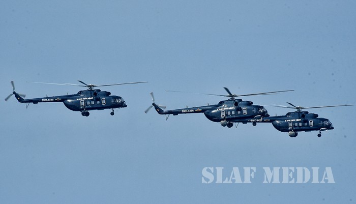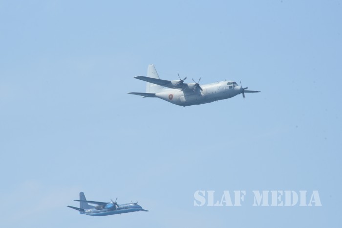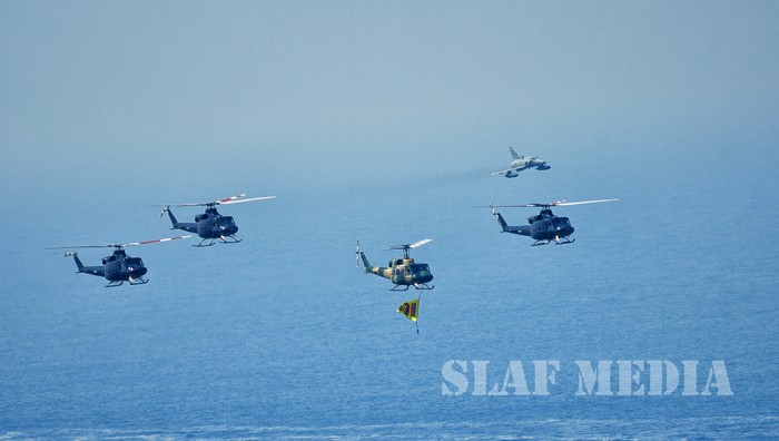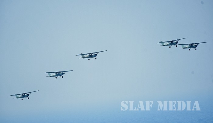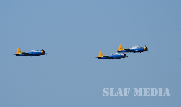 Director Air Operations of SLAF Air Vice Marshal Sudarshana Pathirana coordinated the Flypast, comprising 30 Aircraft including one Bell 212, three Bell 412, four MI 17, five Cessna 150, three PT6, four Y 12, two B 200, one C 130, one AN 32, one MA 60, three K 8, one Kfir and three F 7 aircraft. A kfir aircraft flew through the Galle Face Sky marking the end of the SLAF Aerial Display. Wing Commander Sanath Fanando, Squadron Leader Chanaka Maligaspe, Squadron Leader Kelup Rupasinghe, and Flying Officer Eranga Gamage navigated the flypast while the Aerial Display was coordinated by Air Vice Marshal Prasanna Payoe.