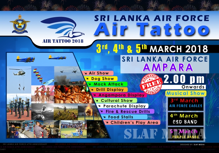 The Sri Lanka Air Force will be celebrating its 67th Anniversary on 2nd March 2018. In upholding its tradition of rich history, the "AIR FORCE DAY" is the premier event in its calendar. This year, the event will be celebrated with great pomp and pageantry with a special exposition and Tattoo at SLAF Station Ampara. The Tattoo will be held from 3rd to 5th March 2018, and will showcase stalls from various units and formations of the Air Force coupled with a Kiddies Play area and food stalls.
