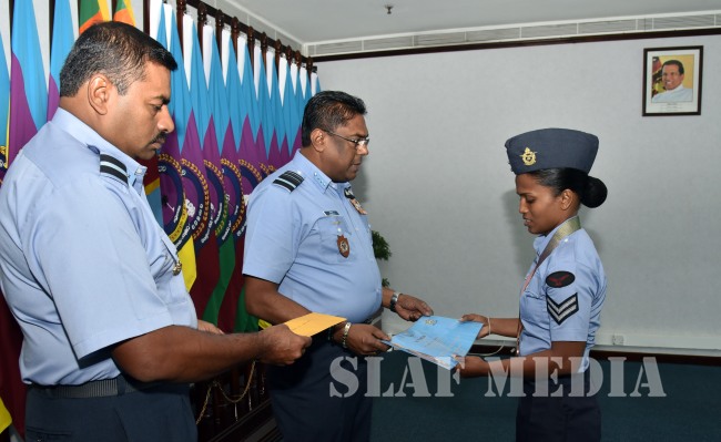 The Commander of the Sri Lanka Air Force, Air Marshal Kapila Jayampathy promoted Leading Aircraftwoman Gomas BDH to the rank of Corporal in recognition of her medal winning performance in the 48 Kg class Weightlifting event at the recently concluded Commonwealth Games 2018 in Gold Coast, Australia. Further, a cash award was also presented to her at a simple ceremony held at Air Force Headquarters.