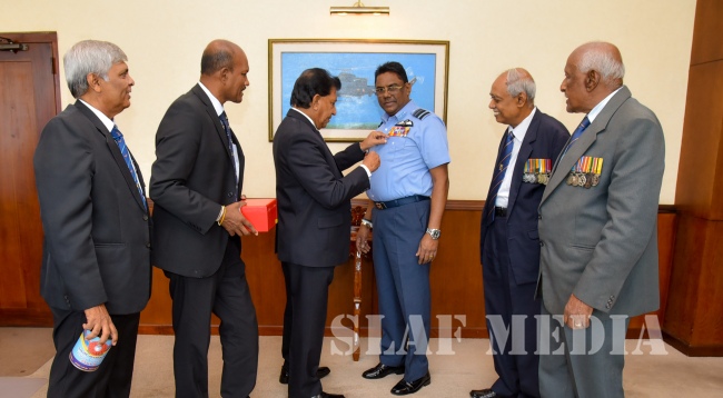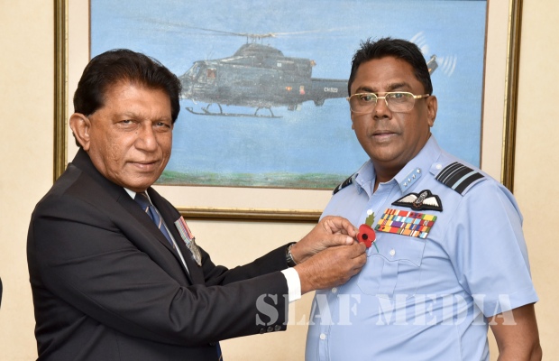 President of the Sri Lanka Ex-Servicemen’s Association Brigadier K.A. Gnanaweera pinned a poppy to commemorate fallen war heroes, on Commander of the Sri Lanka Air Force Air Marshal Kapila Jayampathy, at the Air Force Headquarters today (09 August 2018). The commemoration will also raise funds for the welfare of war heroes’ families.