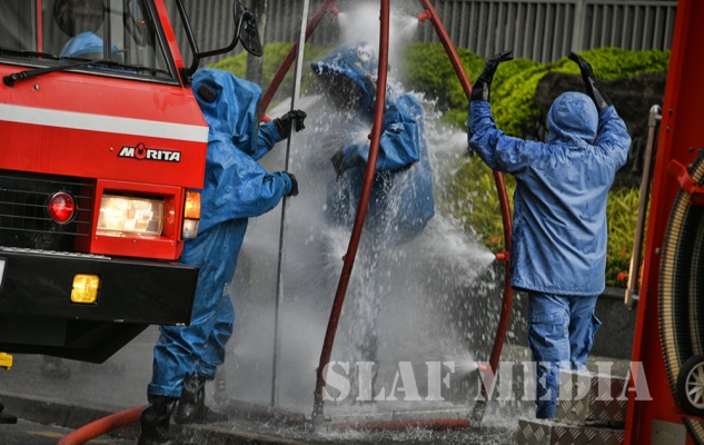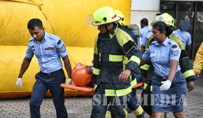Officer In Charge of Fire at SLAF Station Colombo , Squadron Leader RND Senadheera and SLAF Fire Fighters participated in the Firefighting and rescue exercise under the supervision of the Chief Fire Officer of the SLAF, Squadron Leader CP Hettiarachchi.