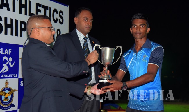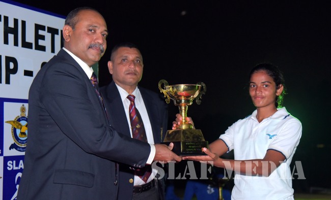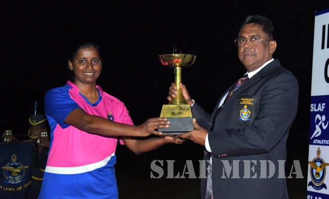 Officer Cadet Perera KIK from the Air Force Academy China Bay was awarded the Lakshman De Alwis Challenge Trophy for the Best Male Athlete while Aircraftwoman Bandara IBHN of the SLAF Base Katunayaka was awarded the Chairman Athletics Challenge Trophy for the Best Female Athlete of the championship.