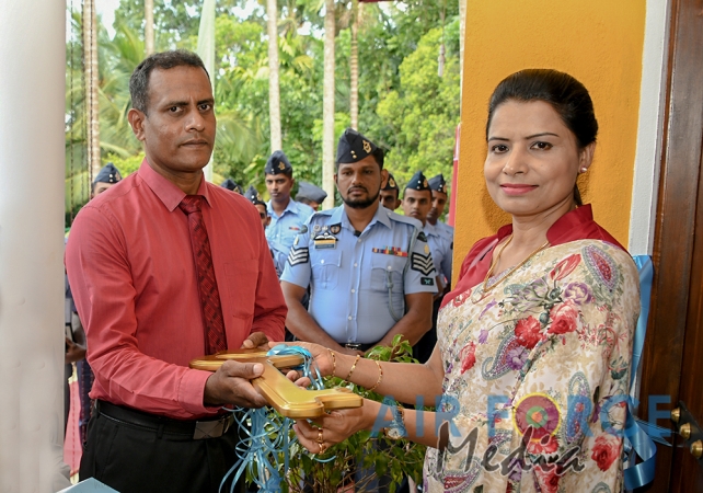A new house constructed under the 'Guwan Lak Sevana' Housing Project of the Sri Lanka Air Force Seva Vanitha Unit (SVU) was handed over to Flight Sergeant Bowanga BWUK. The house warming ceremony was held under the patronage of the Chairperson of SLAF Seva Vanitha Unit Mrs. Anoma Jayampathy at Danthure today (10 April 2019).