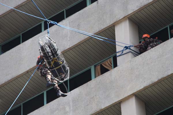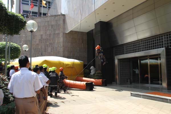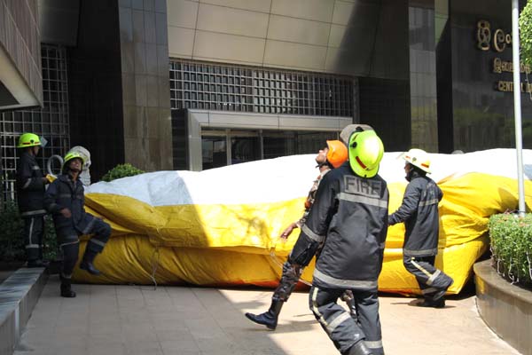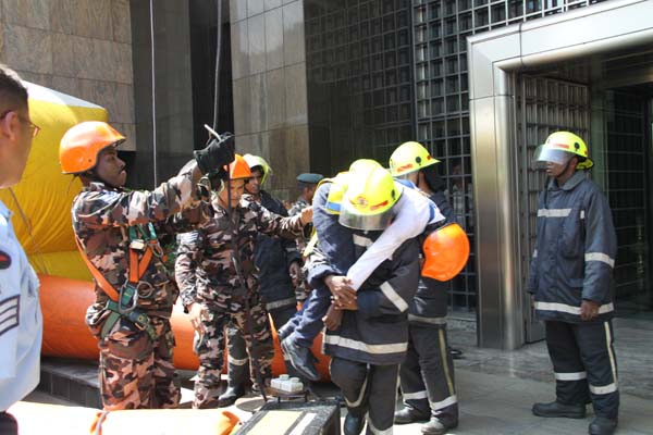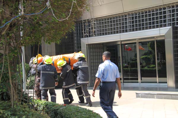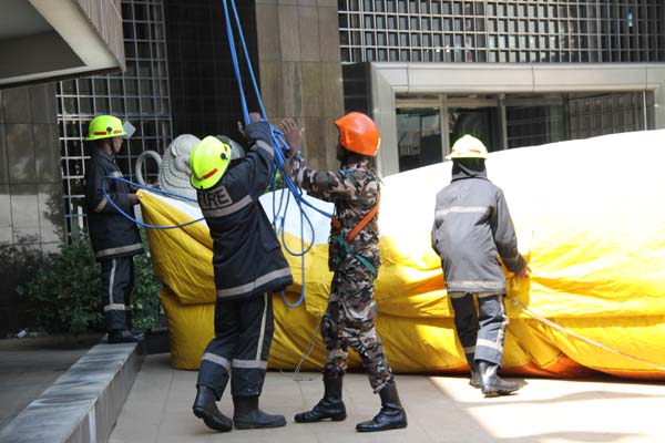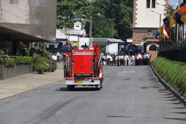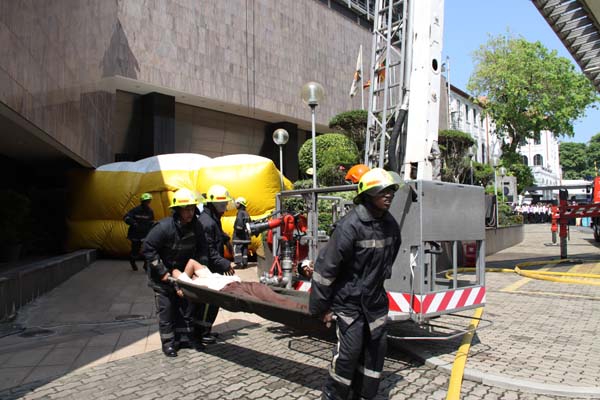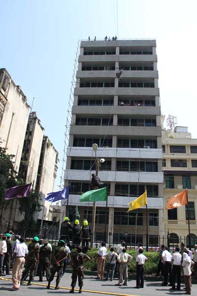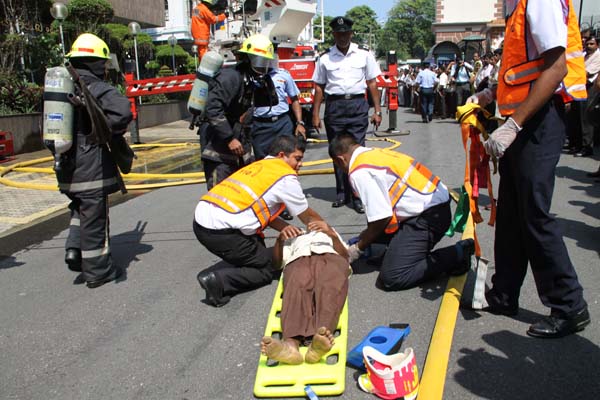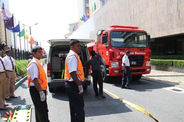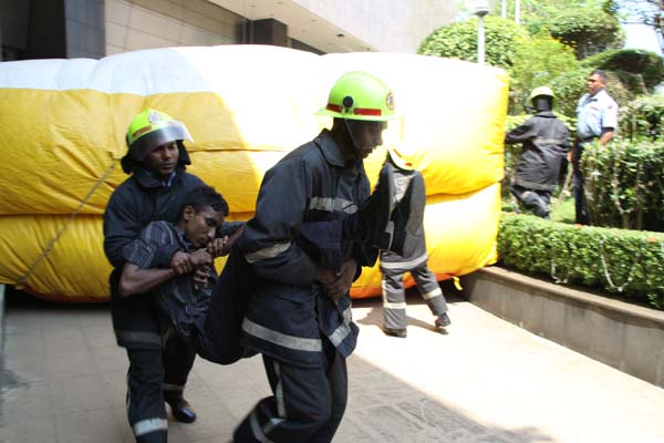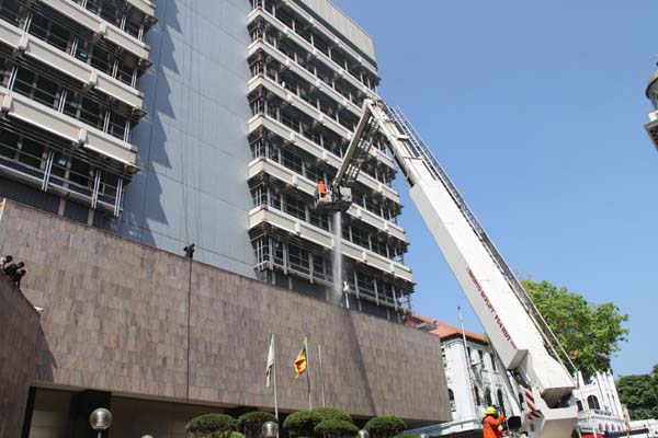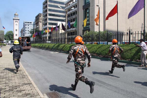 The Fire unit had planned a rescue operation of the employees in 3 categories and employees were made aware of the rescue patterns accordingly. At the sounding of the fire alarm, Central Bank personnel evacuated the building within a matter of a few minutes as a simulated fire blazed atop the front of the complex. The second and third phases of the rescue operation focused on taking personnel who were trapped within the building to safety.