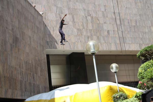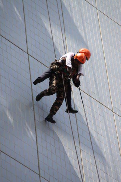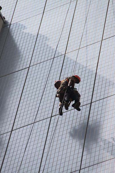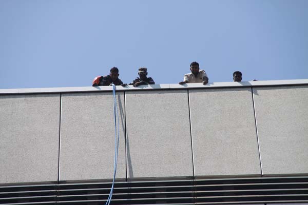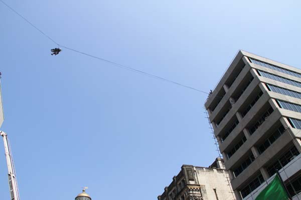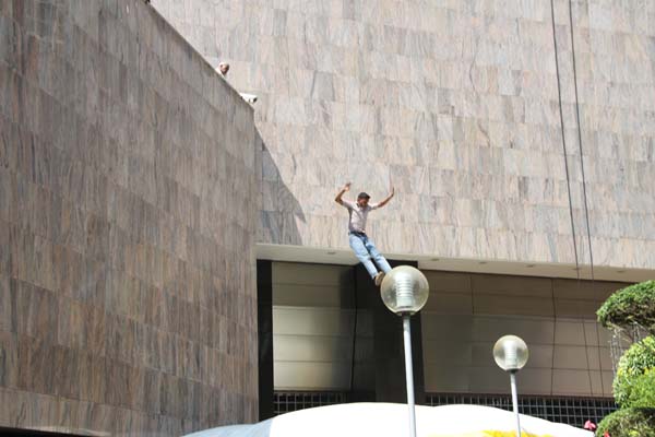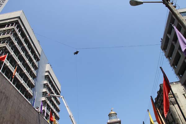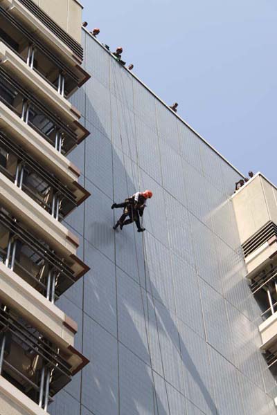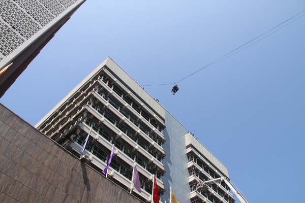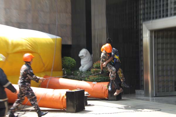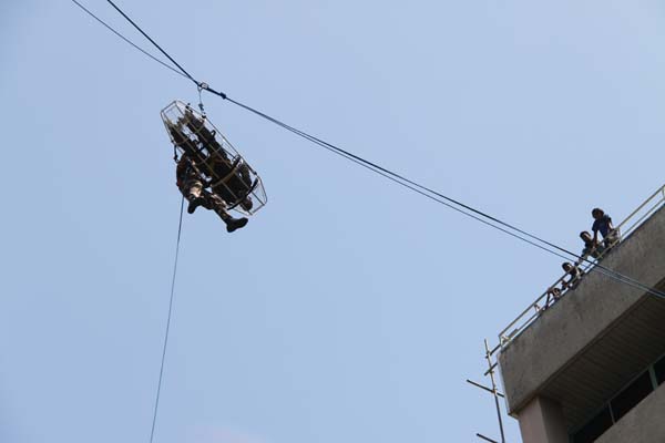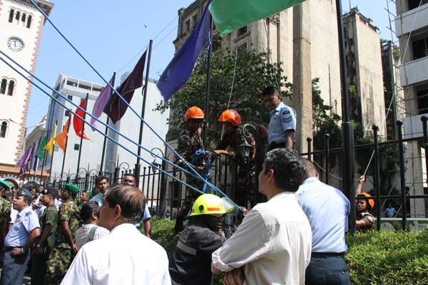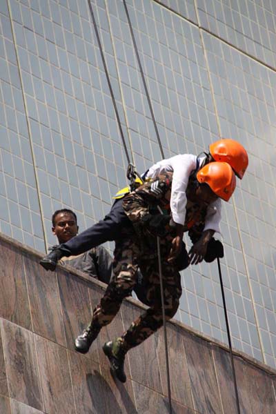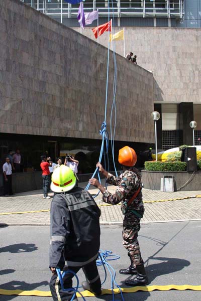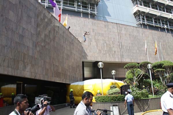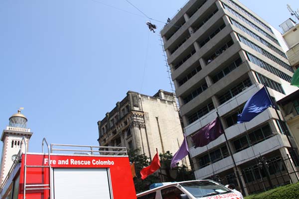 In addition SLAF firemen swung on ropes to display some daring rescue efforts, climbing down the walls carrying individuals in safety harness while in one hair raising rescue the SLAF Fireman carried an individual on ropes strung from the Central bank to an adjoining building.