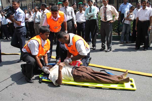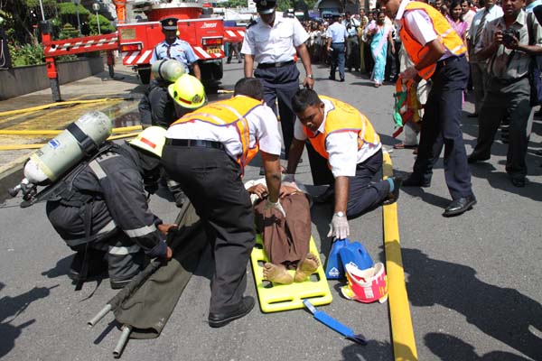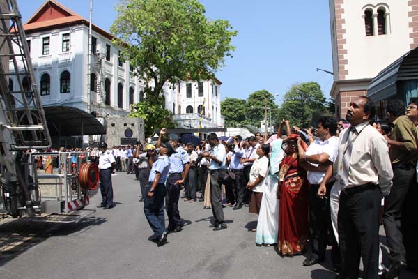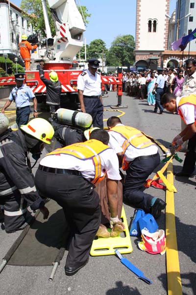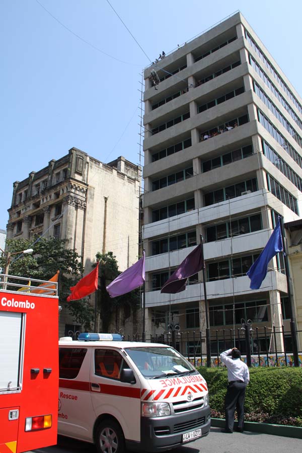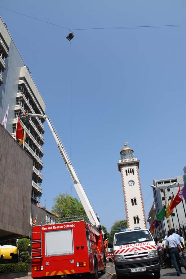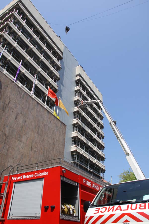 The Central Bank complex was a hive of activity and excitement as the Fire and Rescue Unit of the SLAF in collaboration with the Colombo Fire Brigade conducted a successful fire fighting and rescue exercise on the morning of 16 December, 2010.