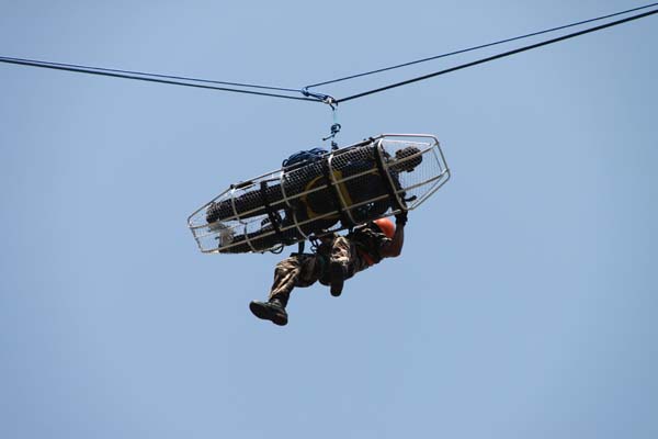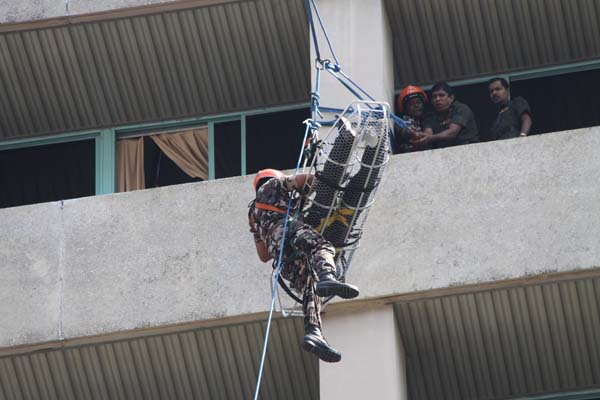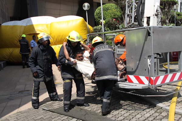 The SLAF Fire and Rescue Unit employed 2 Bronto Sky Lifters to rescue employees of the upper floors while staff on the lower floors was rescued using inflated landing gear. Fire trucks with heavy duty water hoses doused the simulated flames simultaneously. The rescue personnel also demonstrated CPR maneuvers and evacuated injured civilians to ambulances.