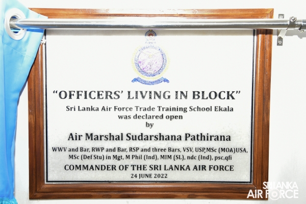 The Commander of Air Force, Air Marshal Sudarshana Pathirana declared open the newly constructed Officers’ Living/In Accommodation Block today (24 June 2022) at SLAF Trade Training School Ekala.