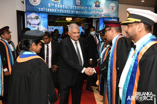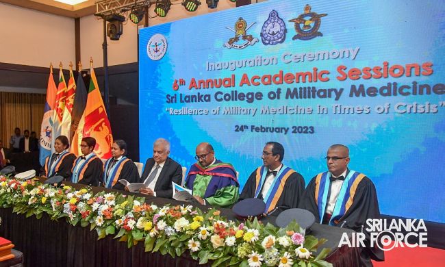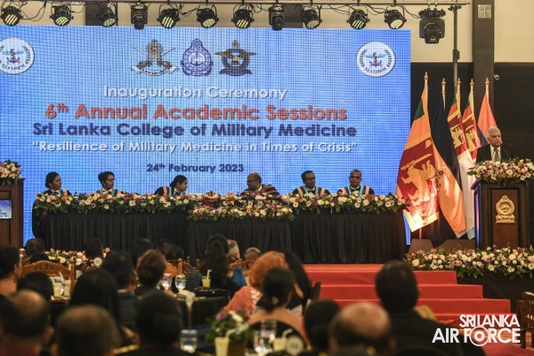 The 6th Annual Academic Sessions - 2023 of the Sri Lanka College of Military Medicine commenced today (24 February 2023) at Eagles' Lagoon View Banquet Hall in Katunayaka, under the auspices of the President of the Democratic Socialist Republic of Sri Lanka, Hon. Ranil Wickramasinghe. The guest of honour the Dean of Medicine and professor of Pharmacology, Griffith University, Queensland, Australia, Prof Selvanayagem Nirthanan, Chief of Staff and senior advisor to the President, Hon Sagala Rathnayake, Commanders of Sri Lanka Army and Navy, Chief of Staff of the SLAF, Air Vice Marshal Udeni Rajapakse and senior Officers of the Tri-Services, eminent personalities in the field of Medicine, executive committee and members of the Sri Lanka College of Military Medicine and numerous other dignitaries graced the occasion.