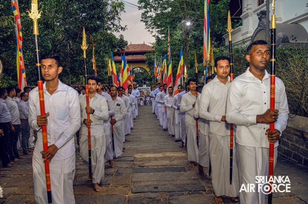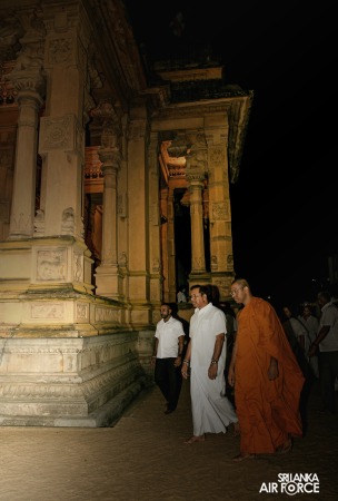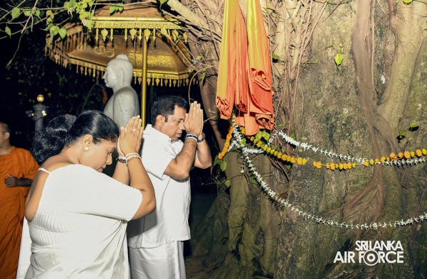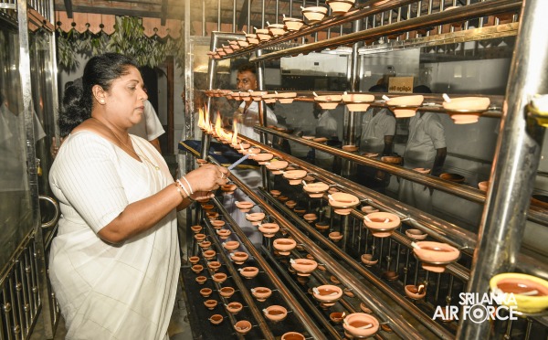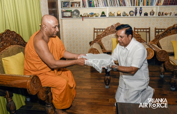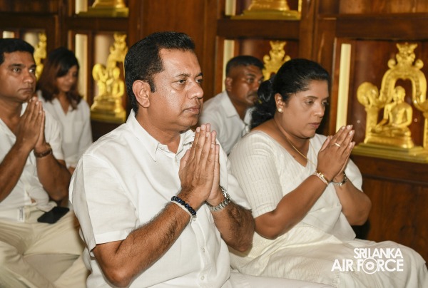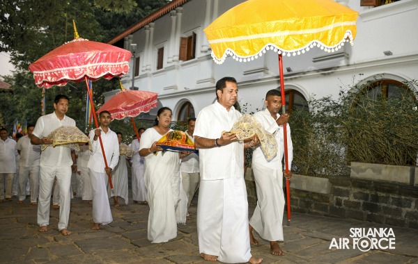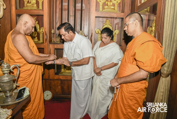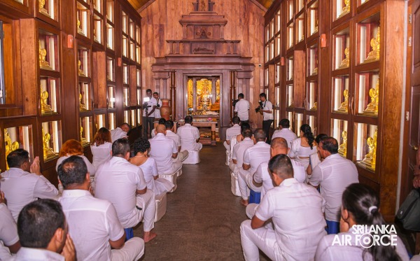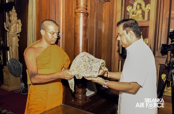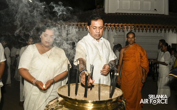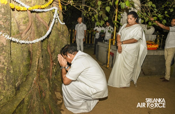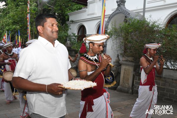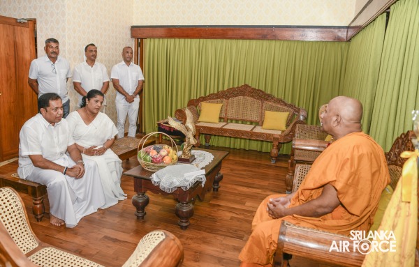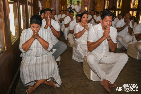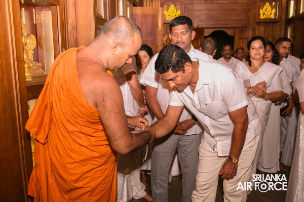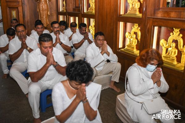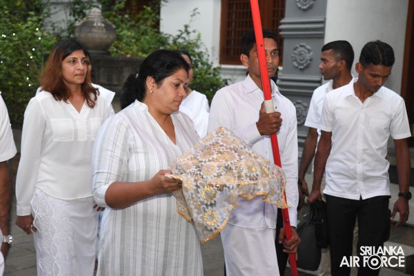 The Sri Lanka Air Force, which is gearing up to celebrate its 72nd anniversary as the "Guardians of the Skies" conducted the "Pichcha Mal Pooja" at Kelaniya Raja Maha Viharaya for the sixth consecutive time. The event was organized under the auspices of the Commander of the Air Force, Air Marshal Sudarshana Pathirana this evening (28 February 2023) by SLAF Station Colombo to invoke blessings for the SLAF personnel and the entire Air Force. The Chairperson of the SLAF Seva Vanitha Unit, Mrs. Charmini Pathirana also participated in the event.