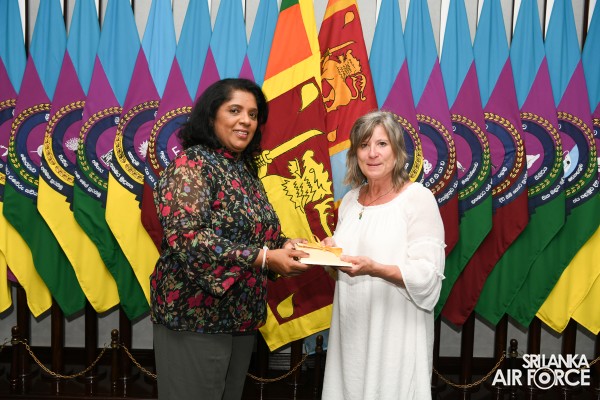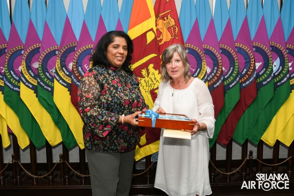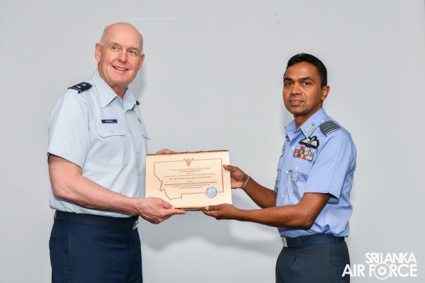 Following the productive discussions, Major General Peter J. Hronek and the crew had the privilege of meeting with the Chief of Staff, Deputy Chief of Staff and Members of the Air Force Board of Management. As a symbol of appreciation and goodwill, official plaques were exchanged between the Commander and the visiting dignitaries. In recognition of this visit, a special memento was presented to Mrs. Traci Hronek, the Spouse of the Adjutant General of the State of Montana National Guard, by the Chairperson of the SLAF Seva Vanitha Unit, Mrs. Charmini Pathirana.